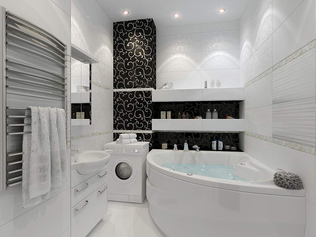 Cuanto más pequeña es el área, se usa más sombra blanca. En este caso, el negro opuesto se usa en pequeños fragmentos, pequeños patrones, inserciones. En los baños pequeños de Khrushchev, puede usar las técnicas que le permiten aumentar visualmente el espacio y ahorrar metros cuadrados. Para esto, se compran muebles de esquina, plomería, espejos grandes, superficies brillantes, se utilizan principalmente cortinas claras.