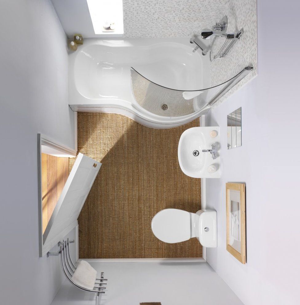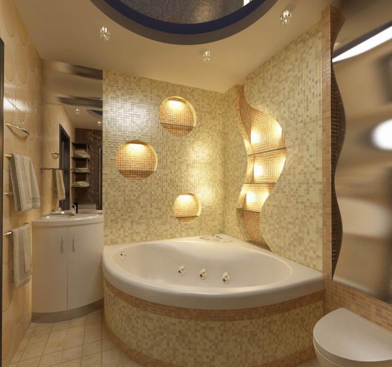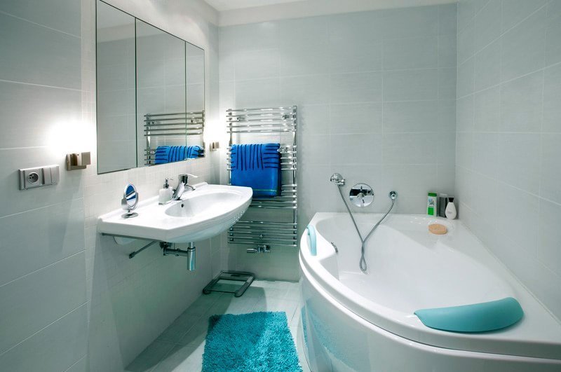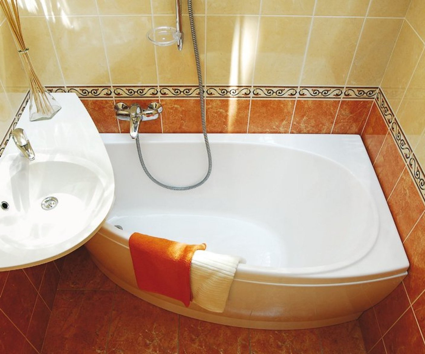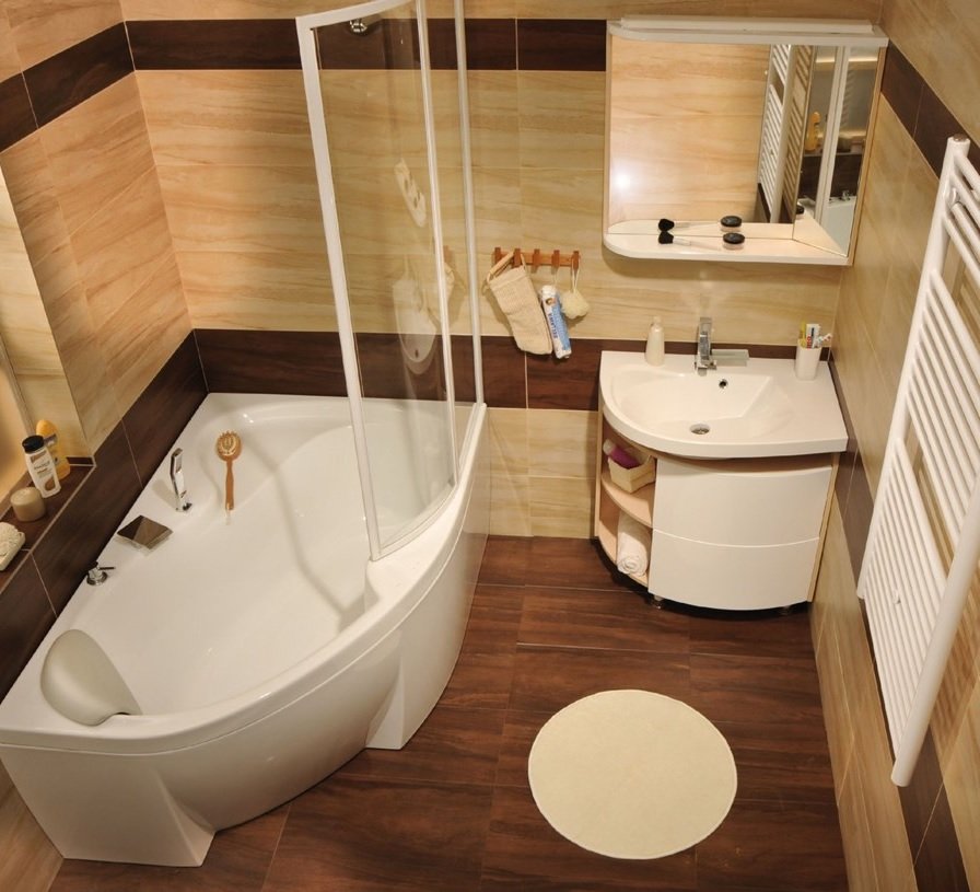 La pequeña bañera de esquina se adapta perfectamente incluso en una habitación pequeña. Habiendo ocupado la esquina opuesta a la puerta, dejará espacio para un lavabo convencional, un inodoro estándar y la libre circulación de una persona, gracias a su forma redondeada. Una bañera de este tipo, equipada con paneles móviles o fijos de vidrio, puede considerarse como una síntesis de una fuente y una ducha tradicionales. Tiene ventajas combinadas:
