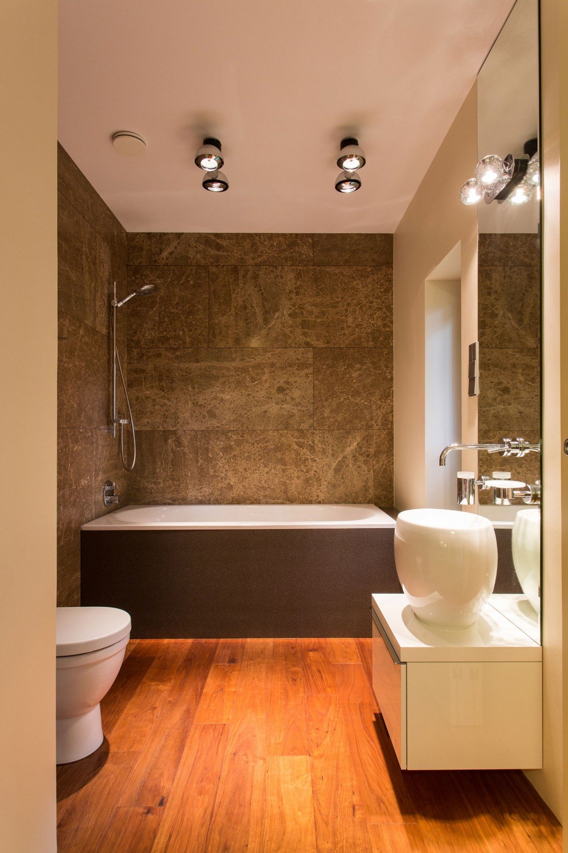 Una técnica de diseño interesante que agrega ligereza a los baños de estilos modernos puede ser la luz de fondo inferior montada en canales con una tapa transparente (vidrio, plástico) al ras con el revestimiento del piso principal.