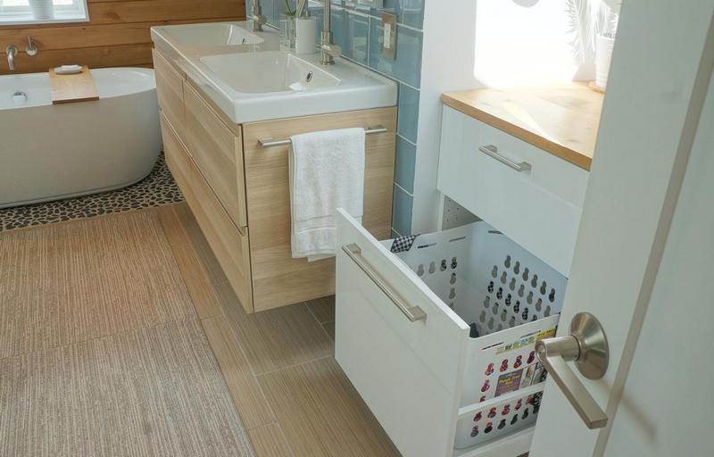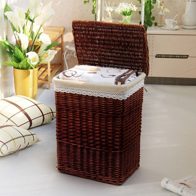 Si la cesta de la ropa está a la vista, se debe proporcionar un elemento de cierre para que el tipo de ropa usada no estropee la atmósfera general de un rincón acogedor para relajarse. Esto puede ser una tapa separada o, en forma de una bolsa suave, un cordón. El requisito principal es la presencia de orificios de ventilación, de modo que las cosas pospuestas hasta el próximo lavado no reciban un olor desagradable a humedad y se ventilen.