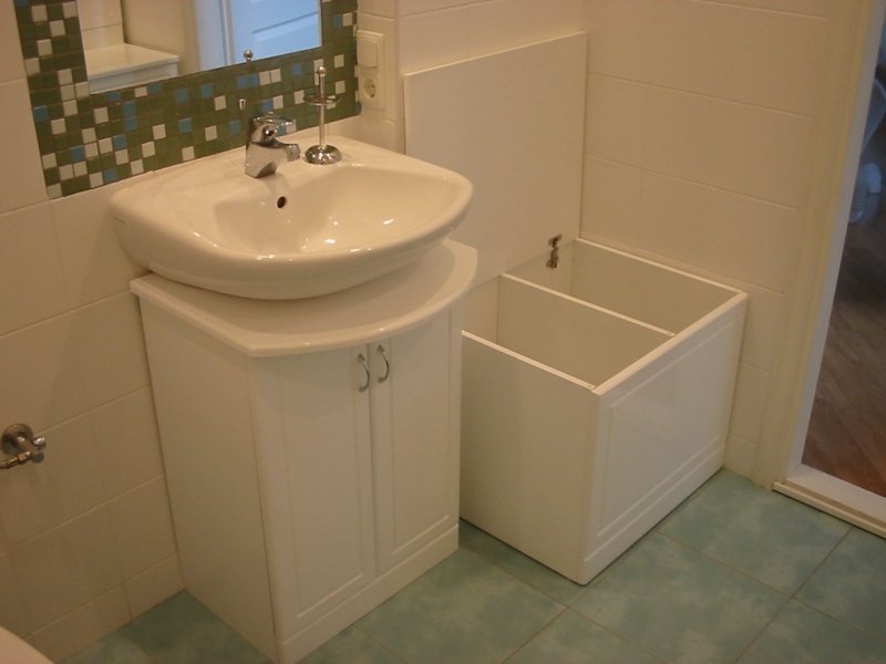 Se imponen requisitos especiales sobre la absorción de agua de los materiales utilizados para la fabricación de muebles de baño. Materiales de placa modernos resistentes a la humedad preferidos, o piedra artificial, vidrio. Sin embargo, si proporciona un acabado resistente a la humedad y una buena ventilación forzada, los gabinetes de madera natural con una cama de cerámica o piedra del lavabo se adaptan perfectamente al funcionamiento en condiciones difíciles.