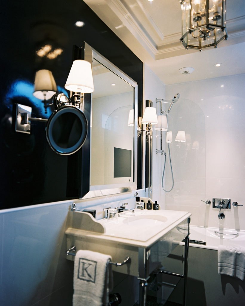 En los edificios prerrevolucionarios, los baños a menudo se encuentran con alturas excesivamente altas. Armonice el espacio sin bajar artificialmente el nivel del techo, posiblemente utilizando una lámpara de araña en la suspensión. Una fuente de luz volumétrica llenará la parte superior del baño, haciéndolo más proporcional.