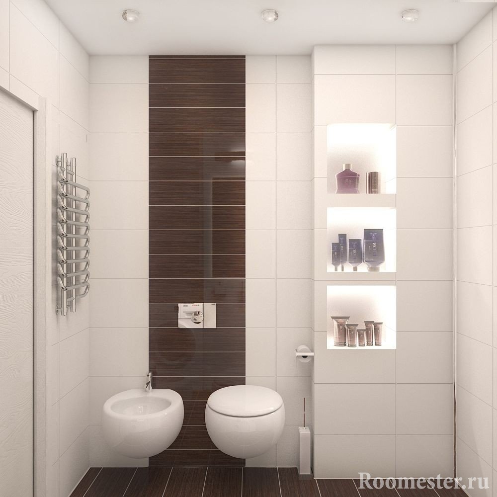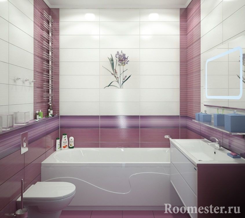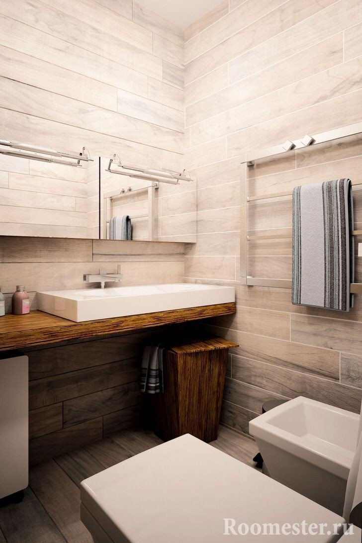 Si lo desea, se pueden distinguir zonas individuales: use combinaciones de texturas, haga acentos de color, establezca particiones. Debe haber un mínimo de tres en el baño combinado de áreas de trabajo: