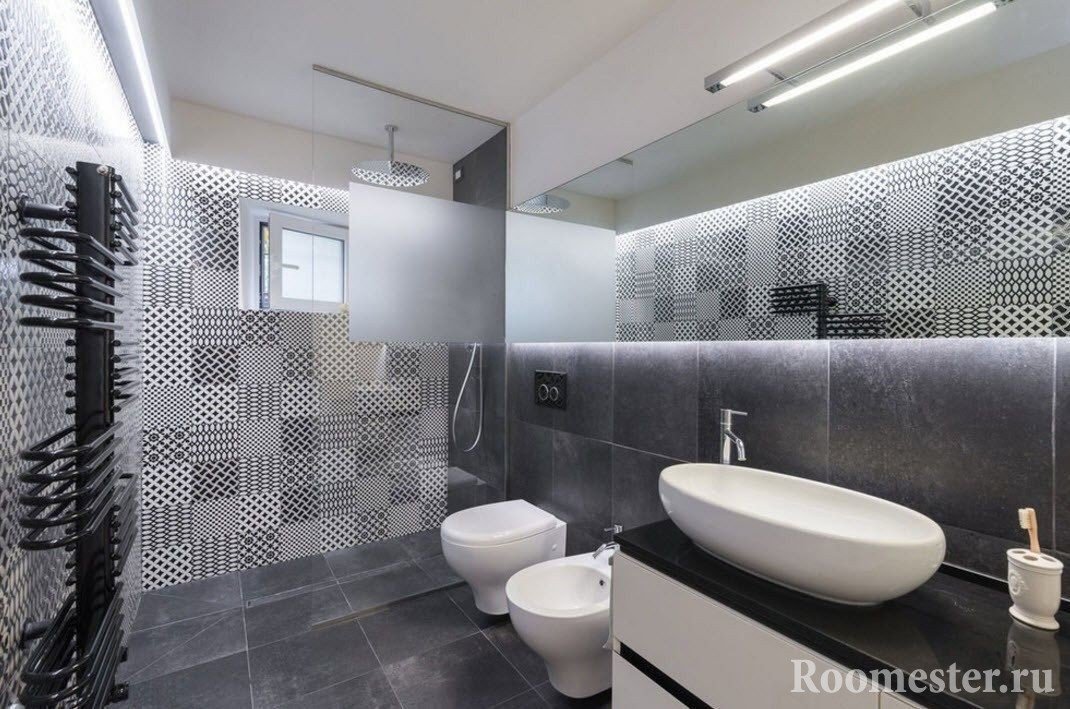 Muy a menudo, el diseño del baño combinado en un estilo moderno se enfatiza con espejos con iluminación de neón, pero no lleva una carga funcional y es solo una decoración que molesta rápidamente. Las superficies reflectantes aumentan visualmente la habitación, pero con su exceso puede ser incómodo.
