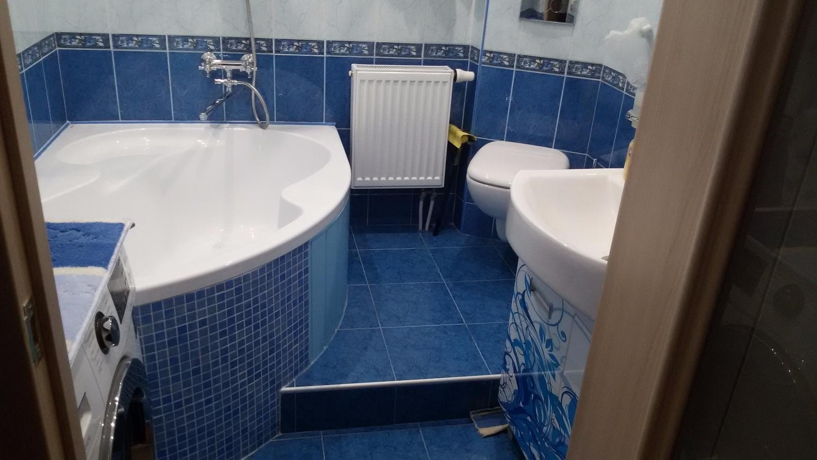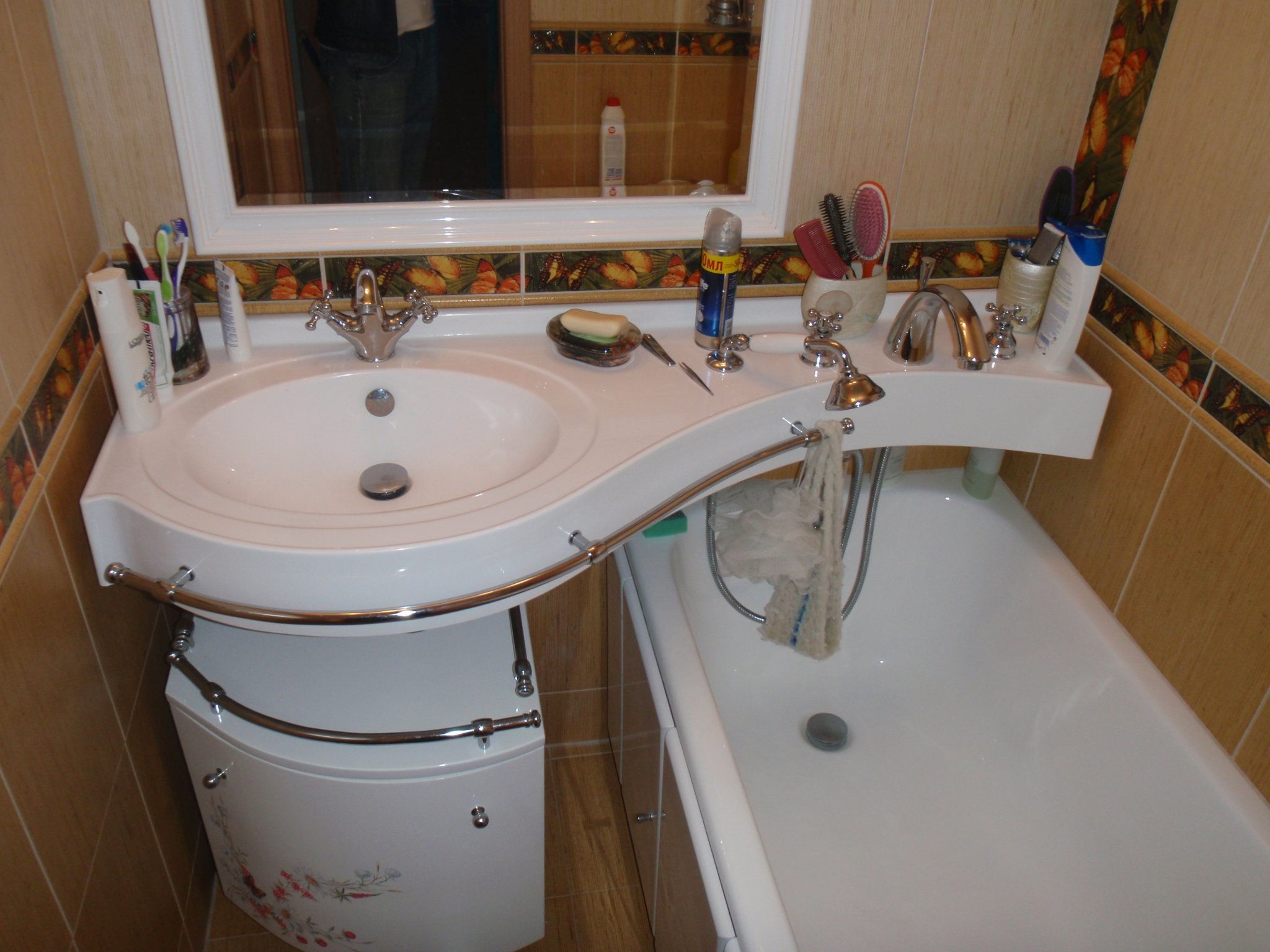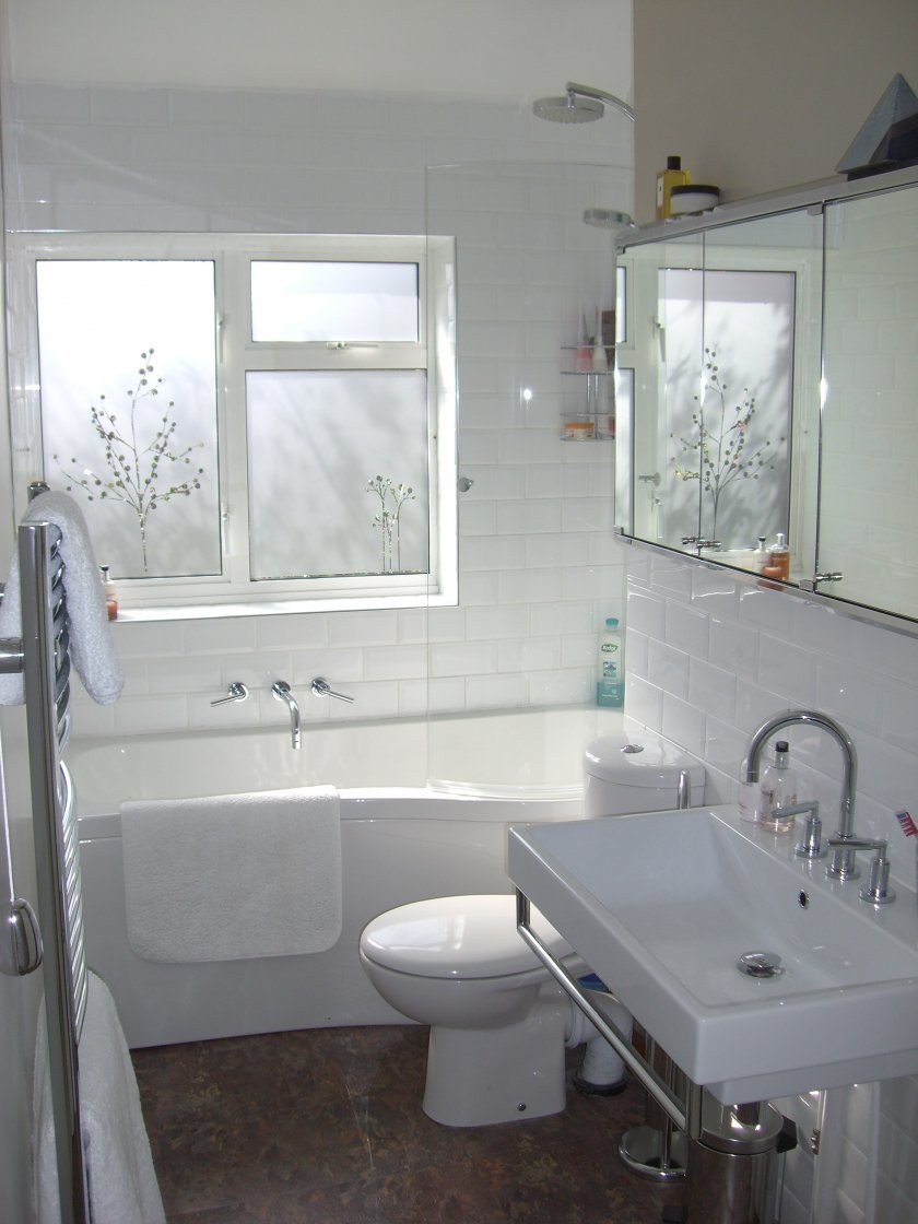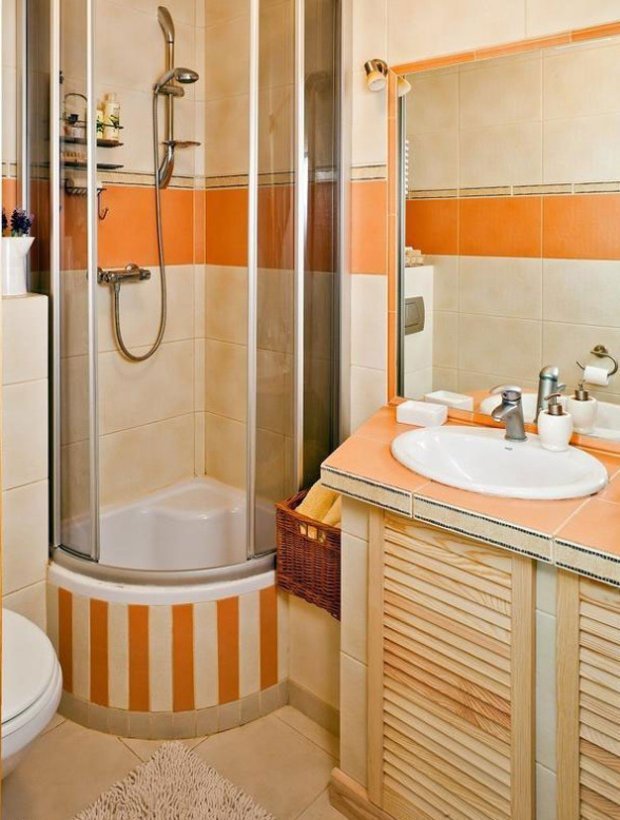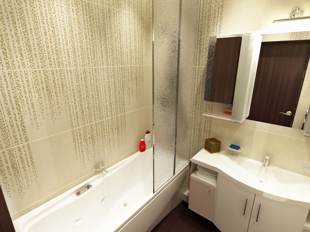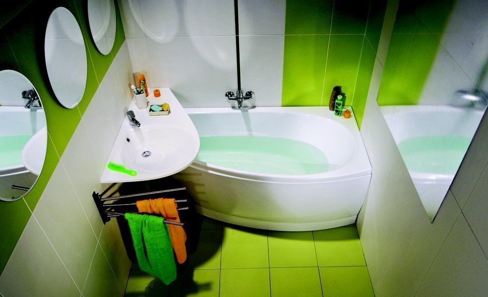 Sin embargo, una solución más simple sería elegir una esquina o una bañera para sentarse. De ninguna manera son inferiores a la funcionalidad habitual, pero le permiten colocar adicionalmente un par de gabinetes o un gabinete. Cubra el espacio restante de las salpicaduras con una cortina normal, pero hay más opciones originales. La bañera se puede convertir en una imitación de una cabina de ducha con la ayuda de paneles de vidrio o plástico económico más transparente. Sus juntas están selladas con sellos de goma o silicona. La superficie se aplica con colores brillantes o pulverización mate. Tal movimiento de diseño le permitirá decorar la habitación y cerrar lo lavable de las miradas indiscretas.