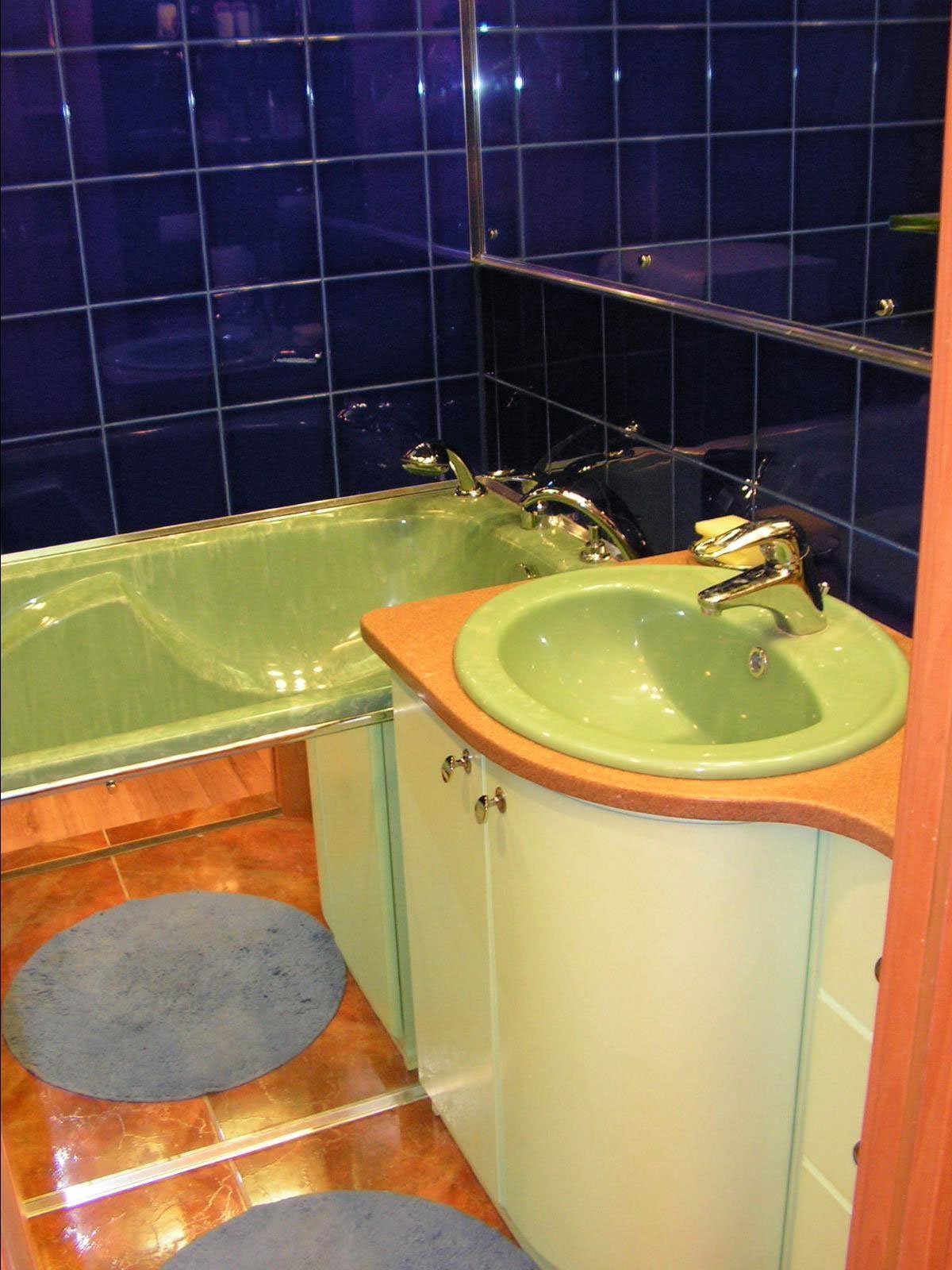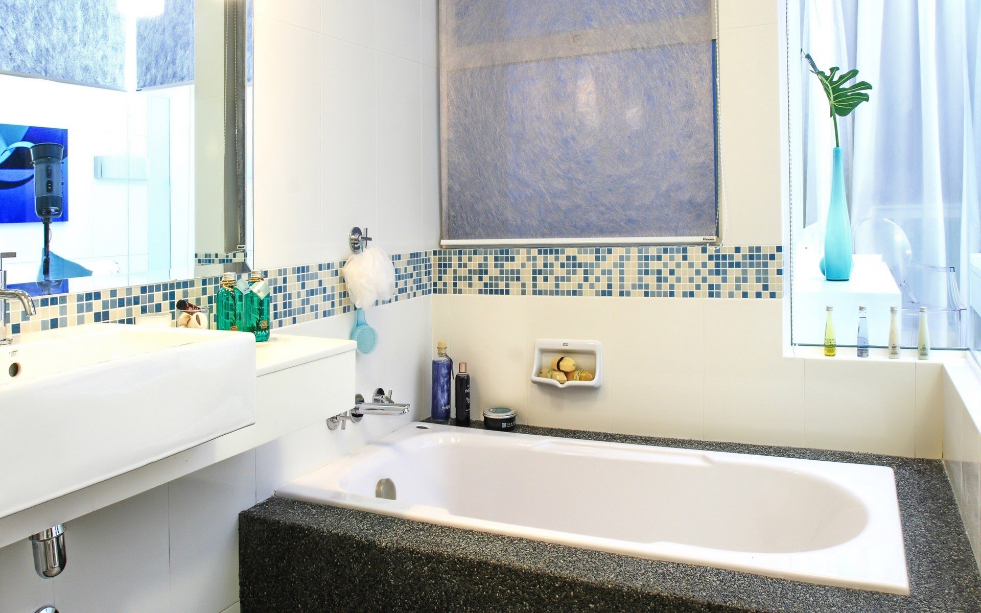 Fondo de pantalla. Material especial diseñado específicamente para baños. Están hechas de vinilo, fibra de vidrio, papel de aluminio o la opción "líquida": yeso decorativo, cubierto con una capa protectora de acrílico;