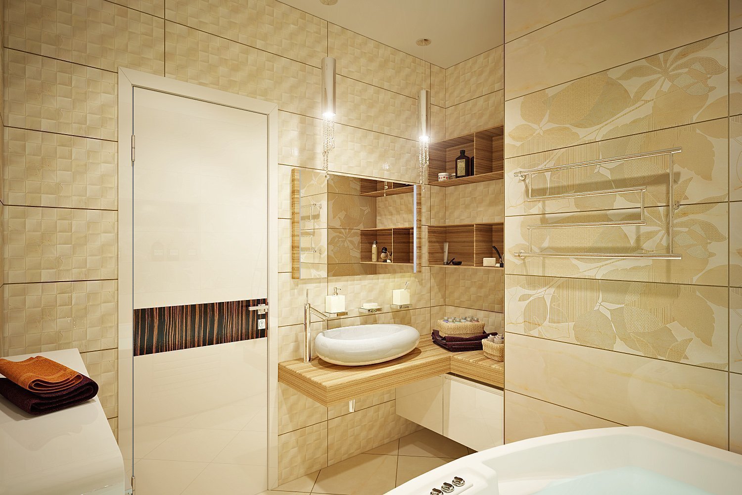 Las baldosas blancas con un efecto metálico se ven no triviales, lo que agrega el volumen necesario a la habitación.