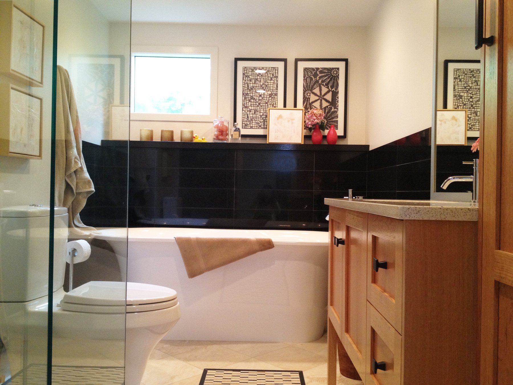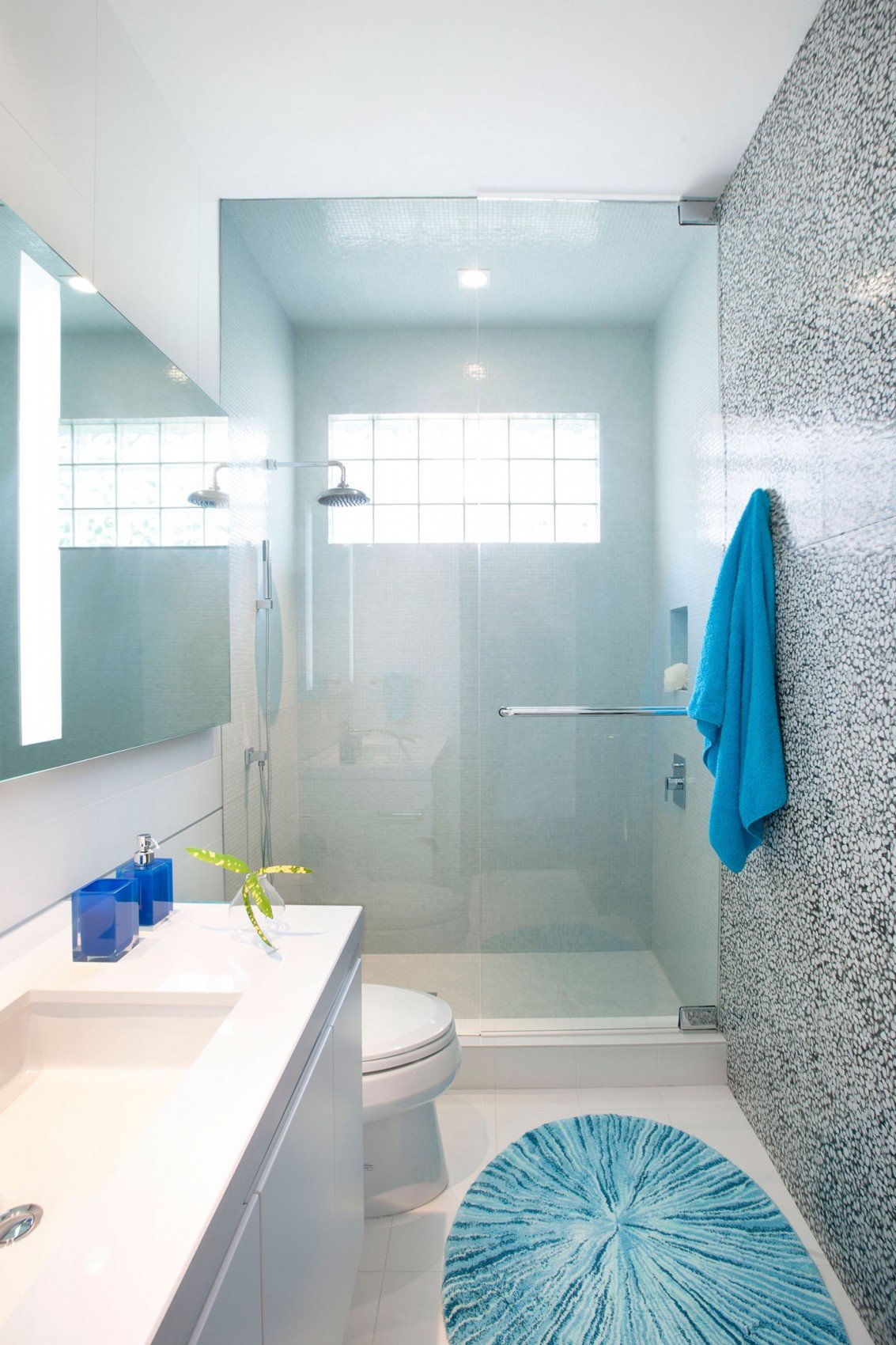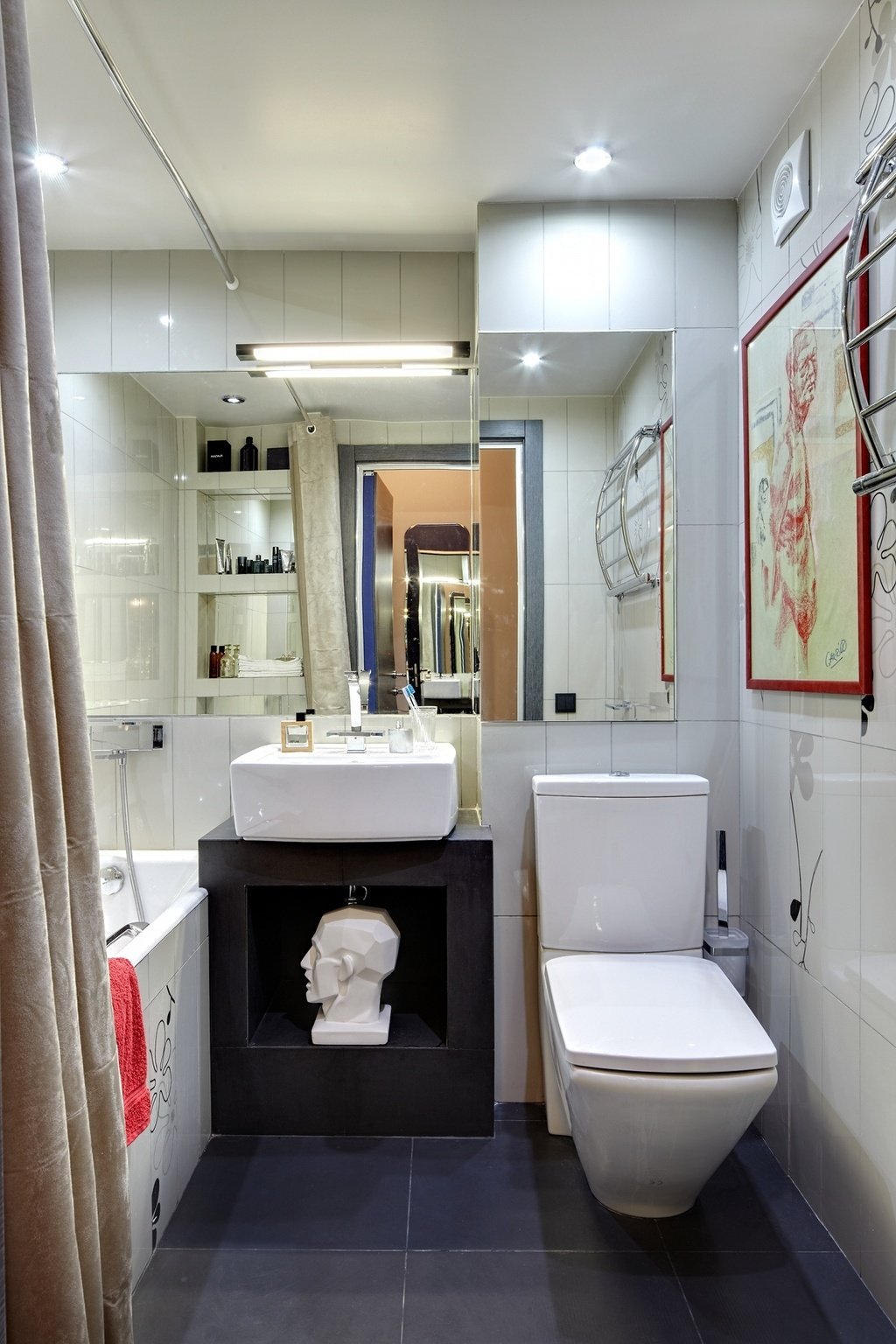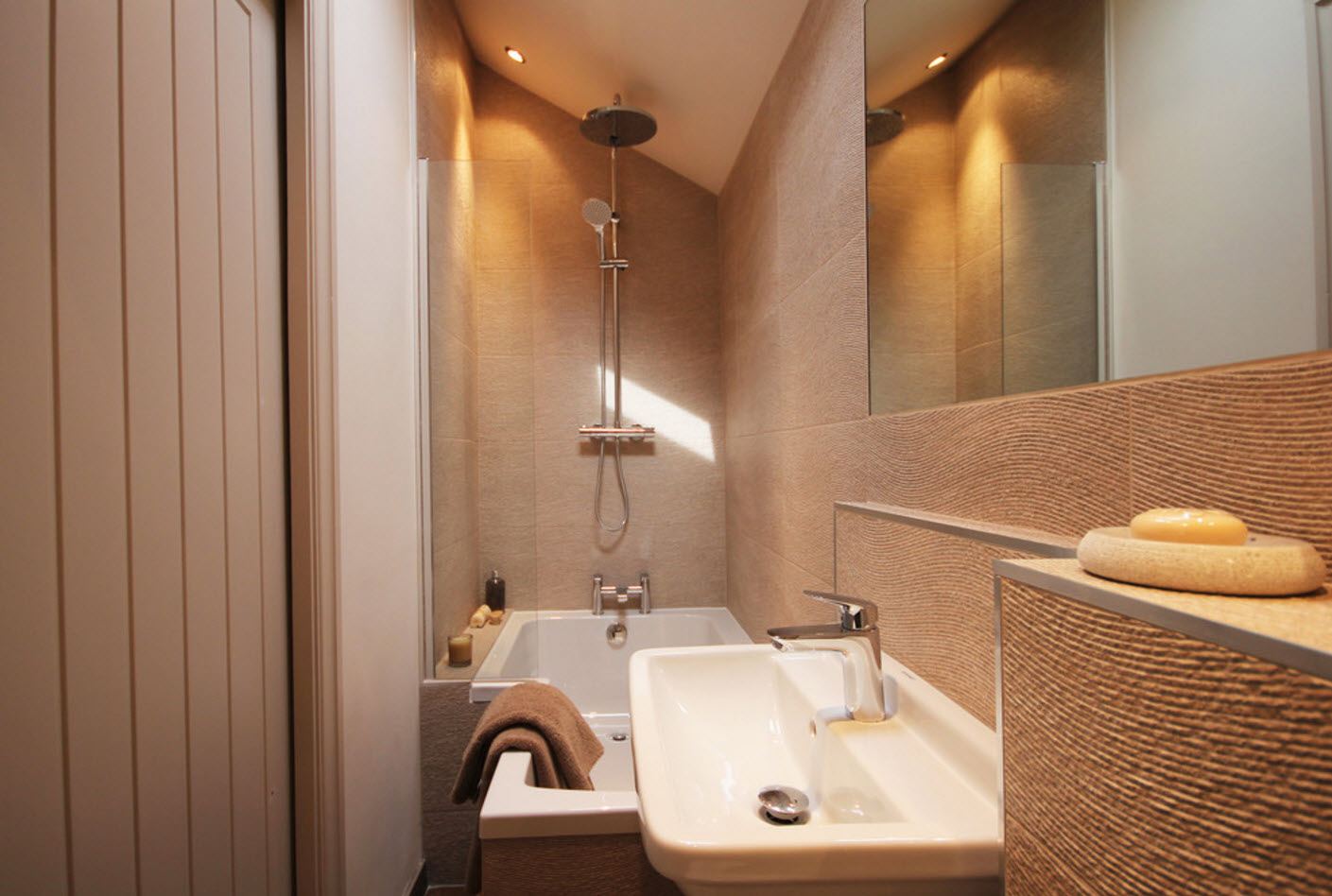 Si tienes suerte y hay una ventana en el baño, entonces no la cierres bien. Las persianas con estilo o los paneles de bambú lo esconderán de miradas indiscretas de la calle por las noches, y durante el día dejarán entrar más luz natural. La abundancia de espejos y superficies de vidrio también salvará la situación. Si ya ha trabajado con la luz, los materiales reflectantes la duplicarán y dispersarán en la habitación. Pero el techo brillante en este caso es un tabú. Creará el efecto de infinito, que estirará el espacio verticalmente e inspirará la sensación de un pozo en lugar de una habitación.