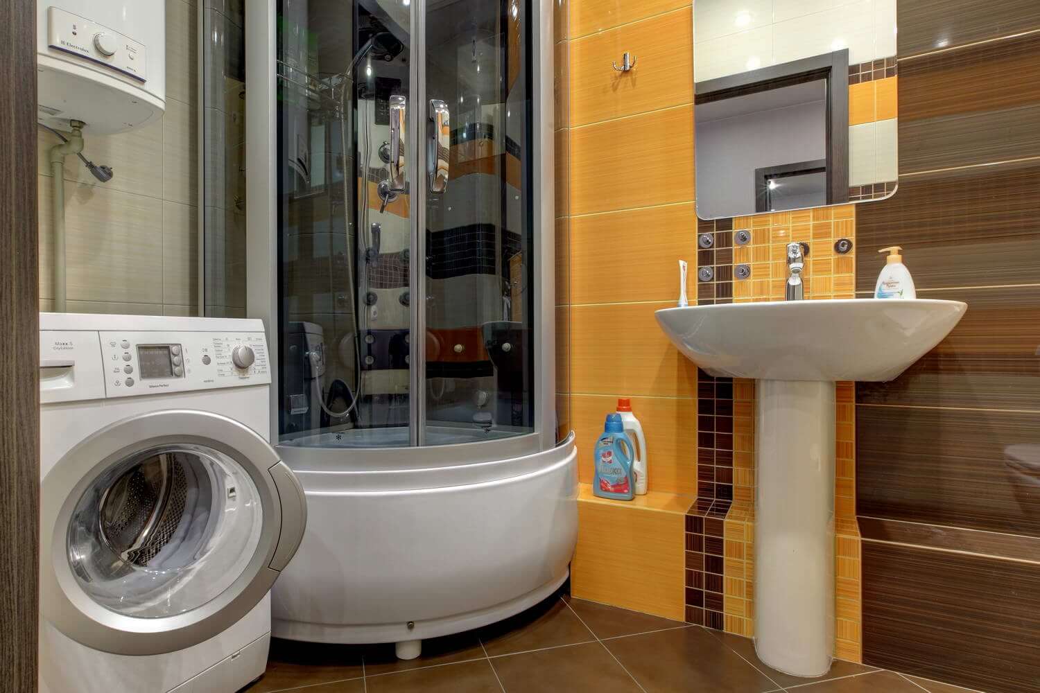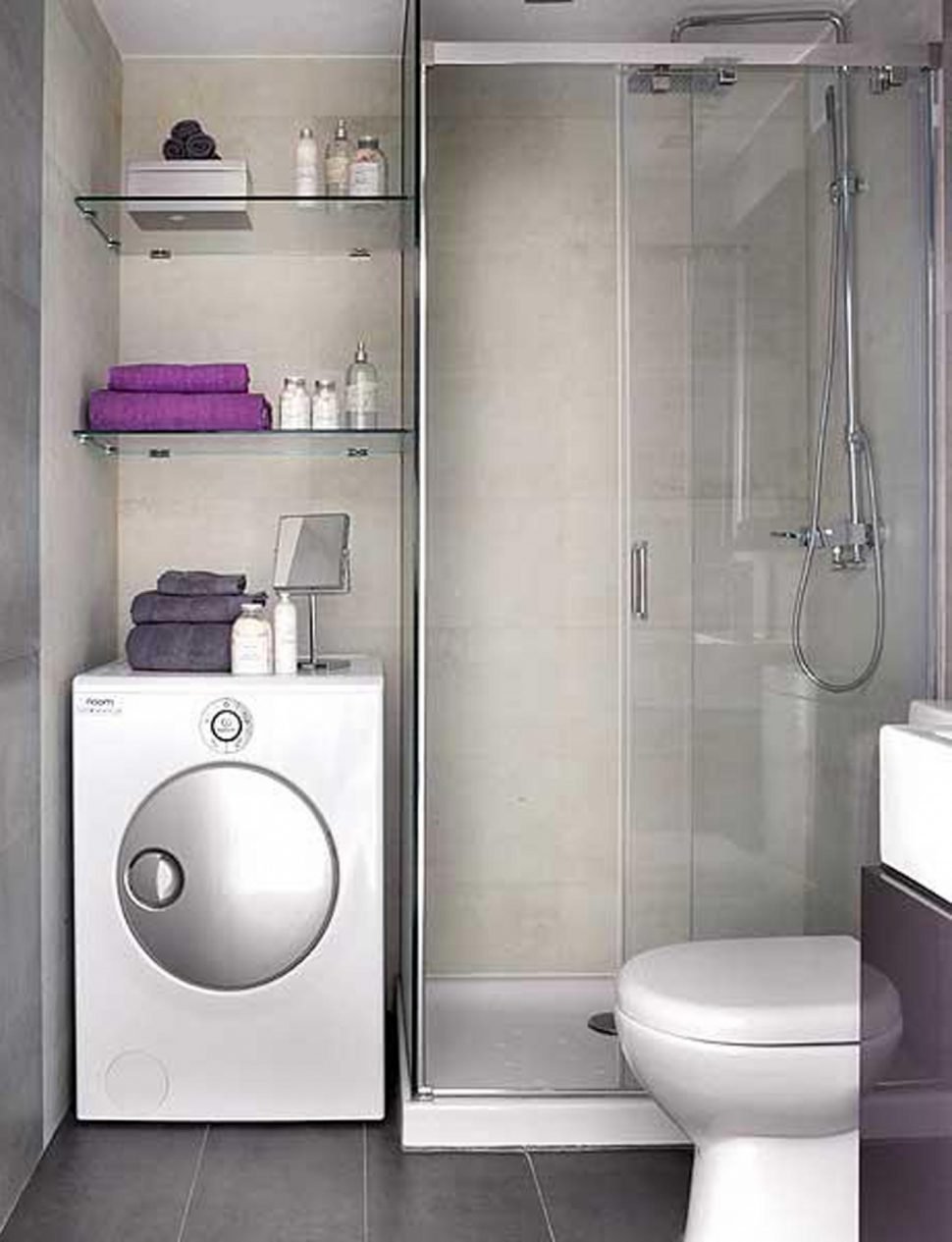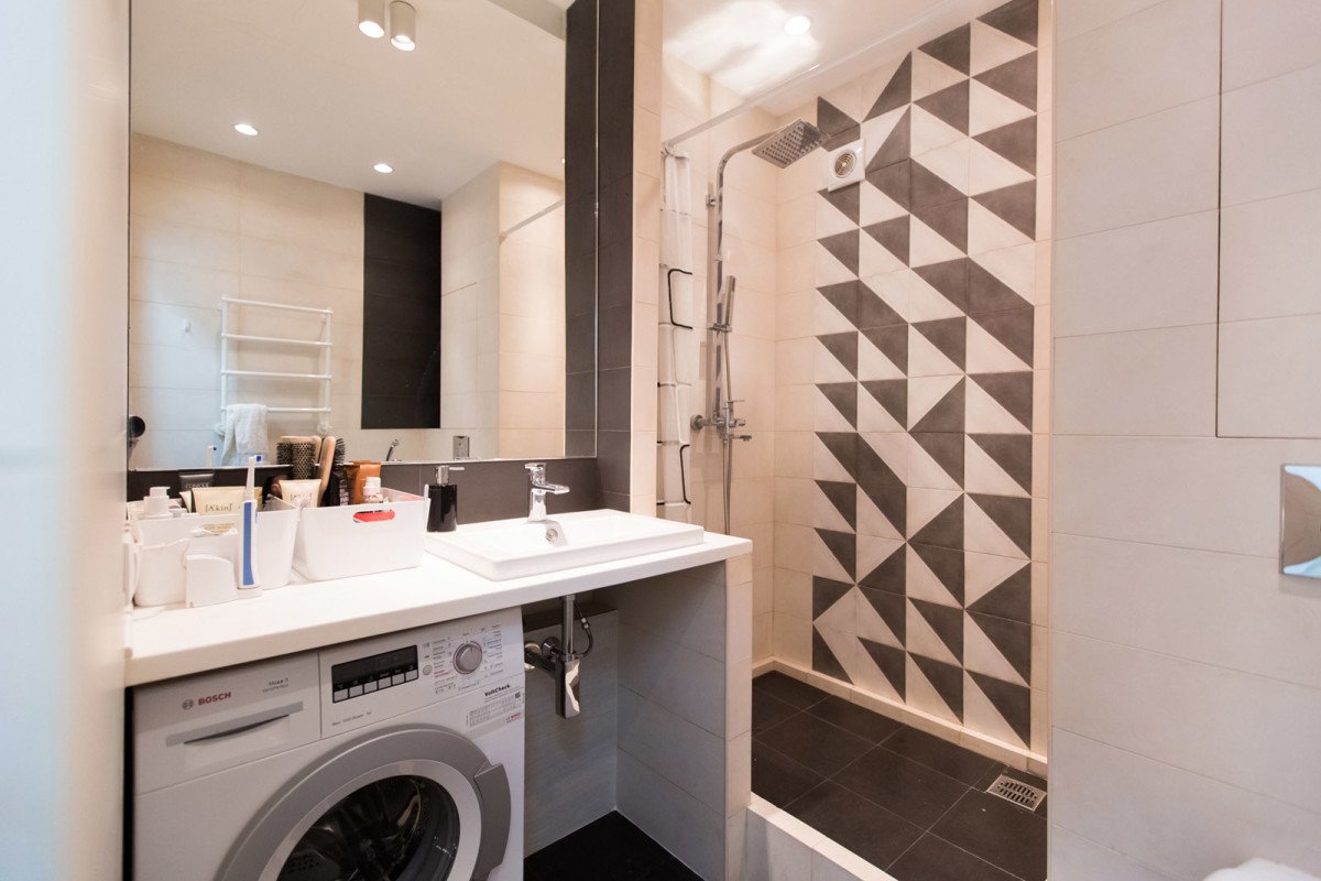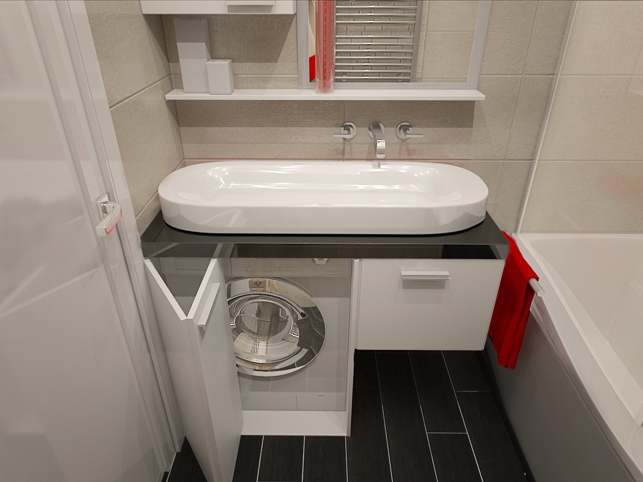 Una lavadora estrecha puede caber debajo del fregadero. En este caso, se usa un cuenco colgante (de pared) o superior con un fondo plano. La máquina reemplazará un soporte tradicional. La opción de alojamiento colgante es extravagante. Lo más probable es que necesite la ayuda de profesionales que instalarán soportes duraderos, asegurando así la estabilidad del soporte. La máquina está "suspendida" sobre el inodoro o la bañera, si esta última tiene un pequeño espacio debajo de la pared. En habitaciones de formas no estándar, si hay un nicho, se usa como gabinete. A continuación se instala una lavadora y estantes para almacenar toallas y productos químicos domésticos en la parte superior. El gabinete se cierra, lo que le permite ocultar su contenido de miradas indiscretas y no violar la estética del estilo de diseño.