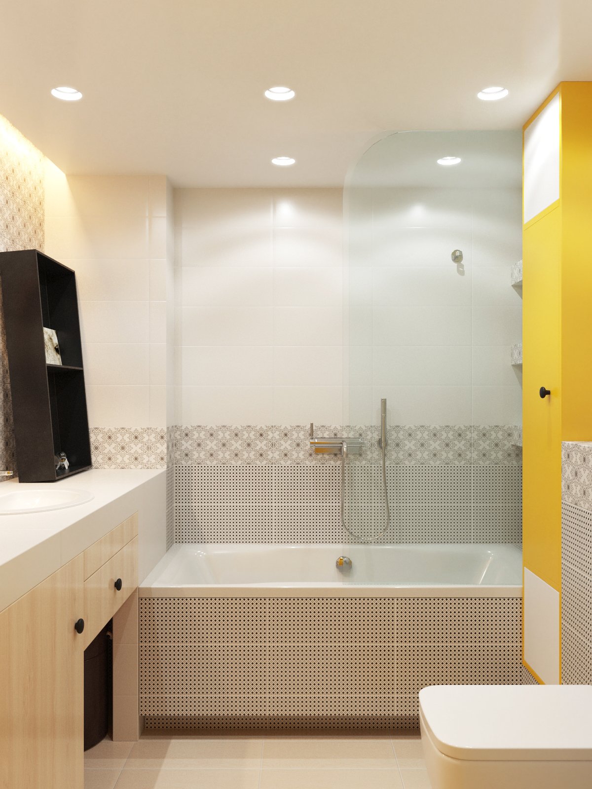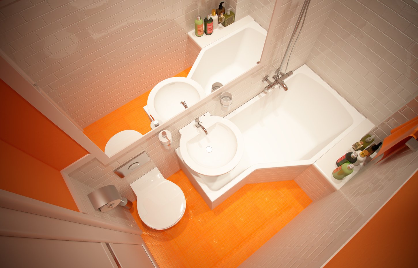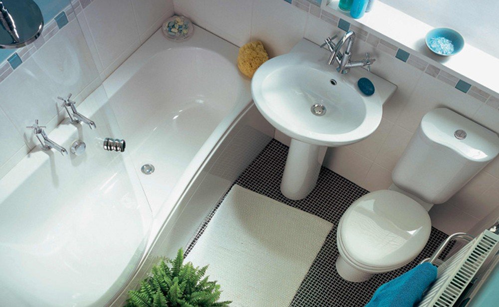 Si la habitación tiene forma cuadrada, tradicionalmente se instala una ducha o bañera en la esquina. Se colocan un lavabo y una taza del inodoro a los lados de las paredes adyacentes.En habitaciones de formas no estándar, a menudo hay "nichos" en los que el inodoro se adapta orgánicamente. Por lo tanto, matará dos pájaros de un tiro: coloque económicamente el inodoro y oculte los defectos del diseño.