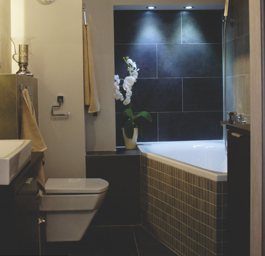 La opción original será el diseño de las paredes en los mismos colores y las esquinas en sus tonos más profundos. Si utiliza baldosas cerámicas para la decoración, el patrón se convertirá en un factor "revitalizante". Puede ser un pequeño mosaico o un par de puntos brillantes dispersos al azar en las paredes. Es inaceptable usar impresiones grandes en el diseño interior de un baño pequeño, ya que "abarrotan" el espacio escaso y lo reducen visualmente.