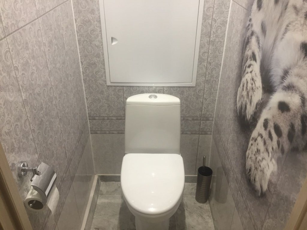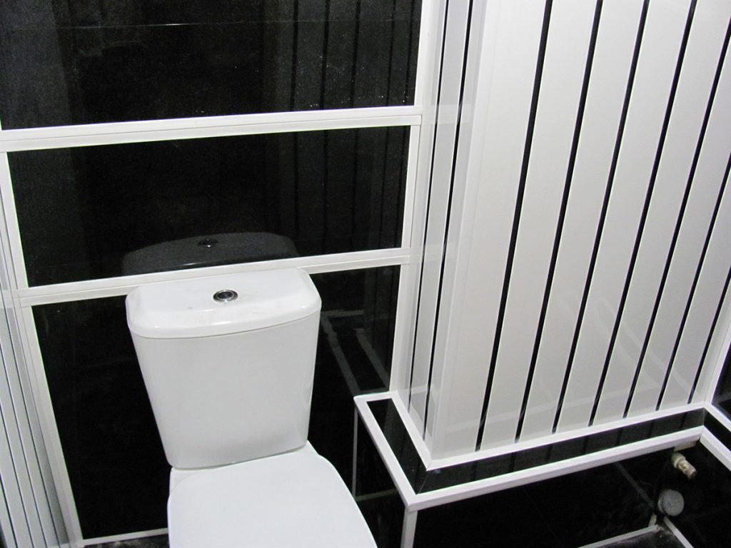 El plástico es el material más económico, fácil de limpiar y de montaje rápido. Construir una construcción ligera y económica hecha de plástico es incluso la fortaleza de un principiante. Este diseño se realiza si las paredes del inodoro también están decoradas con plástico, tienen el mismo color. Una pared falsa con escotillas, puertas o una caja llena está hecha de este material.