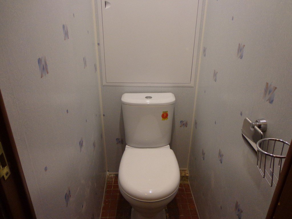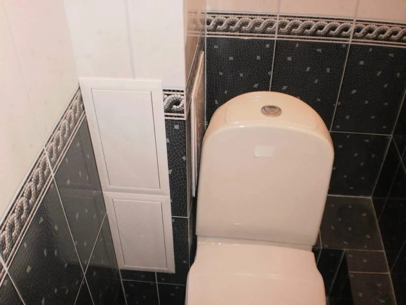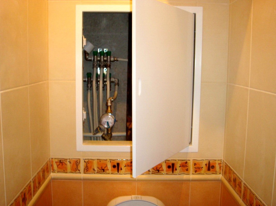 Además, se compra una escotilla de plomería decorativa: cuanto más grande es, más fácil es mantener los medidores de flujo de agua y otros dispositivos. Si se supone que el soporte para el papel higiénico está en la caja, se fija con anticipación un bloque de mortero en el lugar correcto.