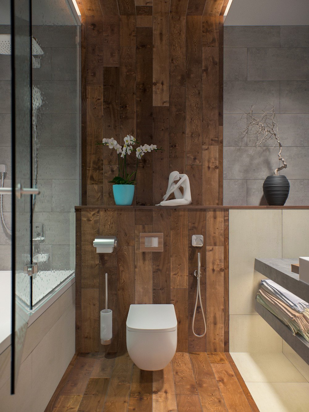 Los paneles de madera, los paneles deben protegerse con impregnaciones especiales, ya que en los baños siempre hay mucha humedad y la madera puede enmohecerse y pudrirse. Hacer que un árbol natural se vea sólido, costoso y en algunos interiores es aceptable solamente. Al decorar, se utilizan láminas de madera, paneles de muebles preprocesados, madera contrachapada. Para crear un gabinete de madera, a menudo se usan puertas batientes del gabinete viejo, unidas al marco de metal, madera.