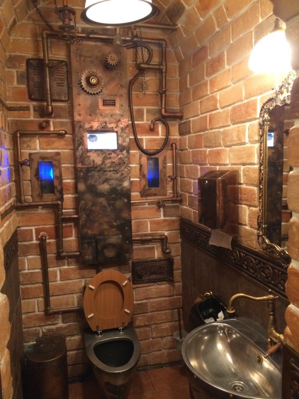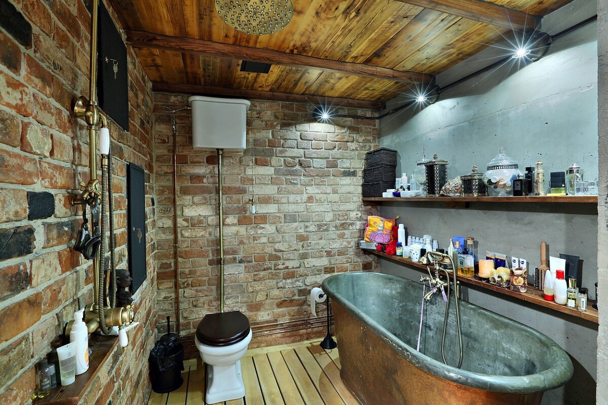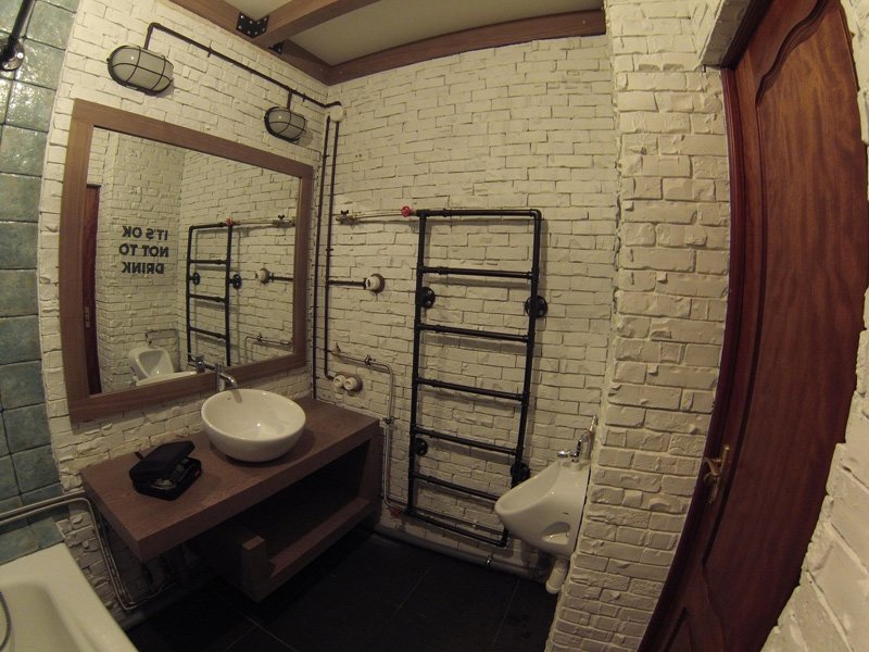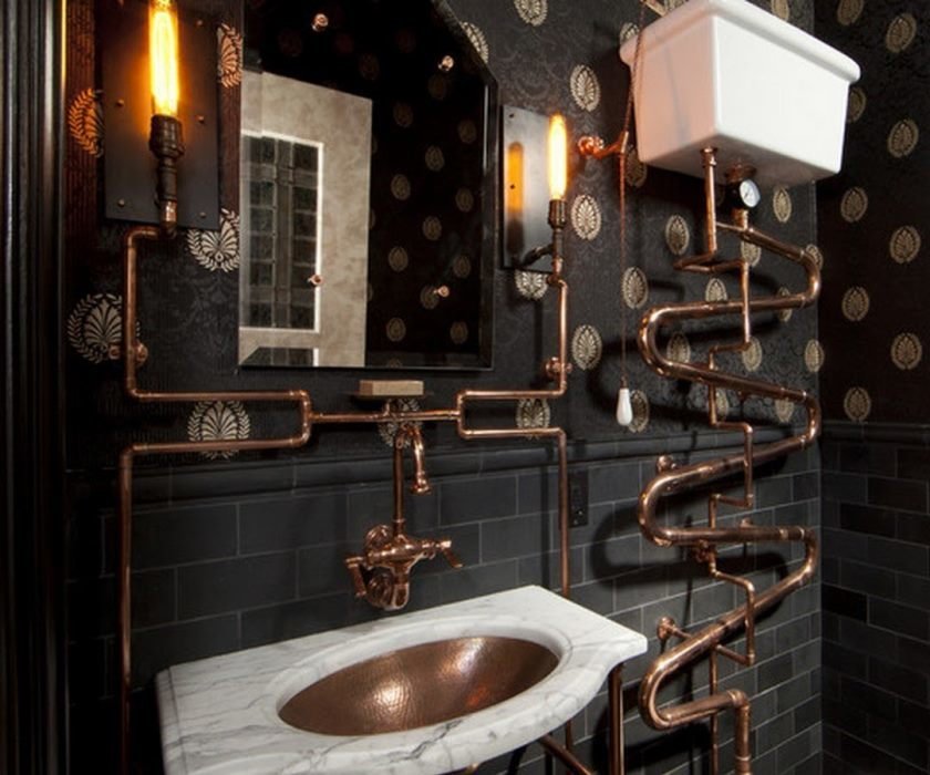 Cuando la tubería se encuentra afuera, están hechos de hermosos materiales: cobre, hierro fundido, acero al cromo, latón. Diseños similares decoran perfectamente los interiores de loft e industrial, de alta tecnología y tecno. No es difícil instalar una tubería de este tipo: las tuberías viejas simplemente se reemplazan por otras nuevas. Los elementos de las habitaciones descritas anteriormente están decorados con válvulas grandes, a veces tienen un diseño más complejo de lo requerido. Como complemento, a partir de las tuberías similares, pero que no funcionan, se hacen varias estanterías y decoraciones de baja funcionalidad en la parte posterior y lateral del baño. Esta opción tiene dos inconvenientes: la probabilidad de quemar si las tuberías se tocan accidentalmente, y también los altos precios por ellas.