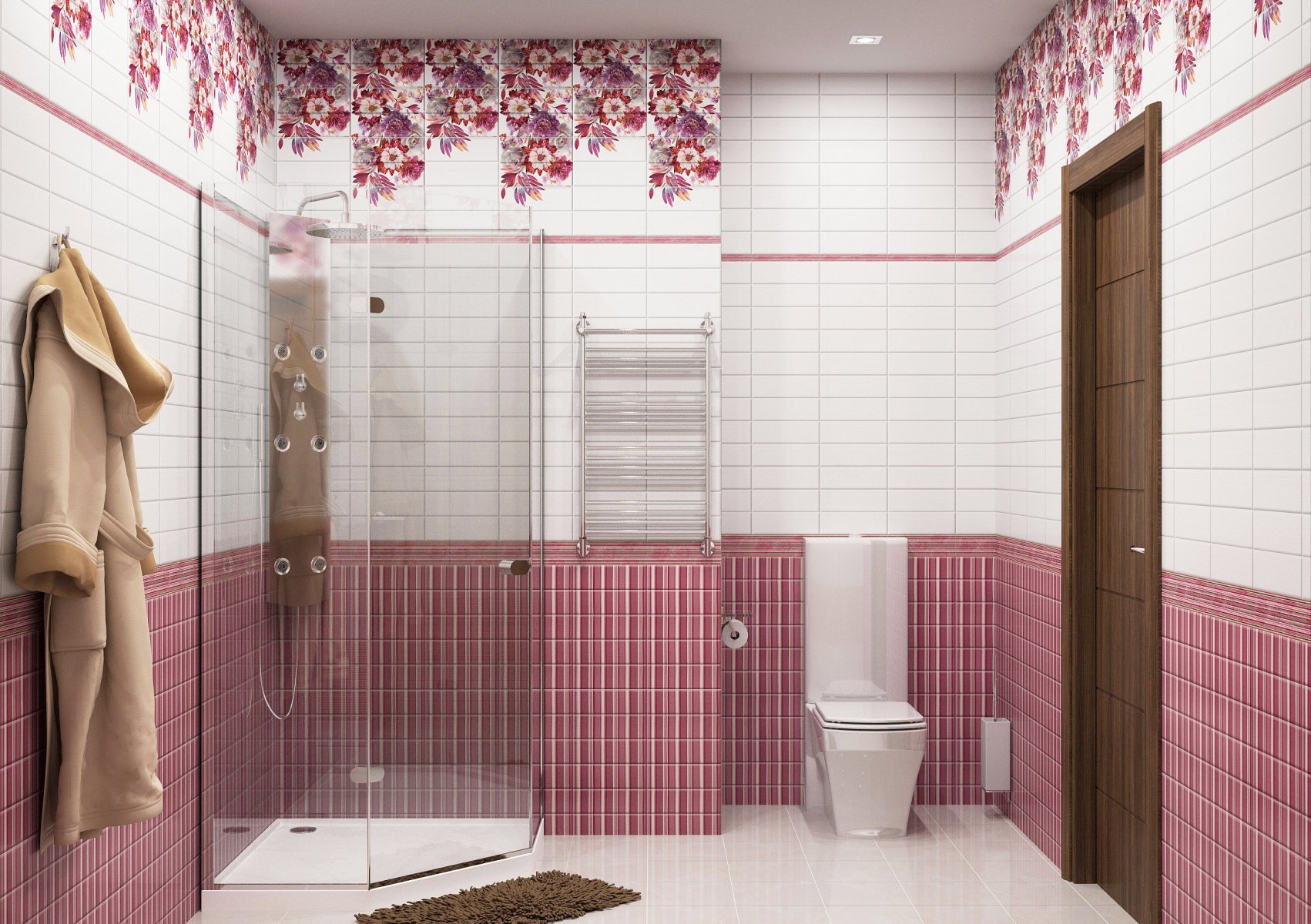 La combinación de tonos se puede usar no solo para decorar las paredes, sino también para resaltar zonas individuales. Puede seleccionar una zona con baño, lavabo o ducha higiénica.
