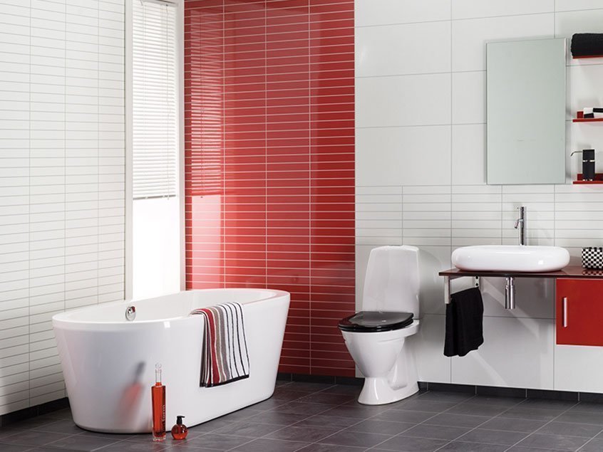 los tonos rojos se pueden enfatizar con colores blanco, negro o crema. Dichas combinaciones son adecuadas para estilos modernos: alta tecnología, arte pop;