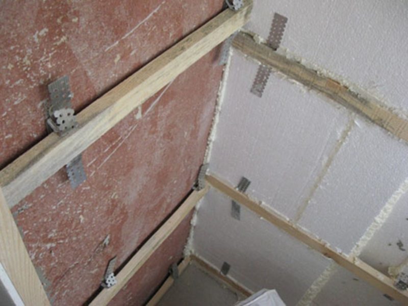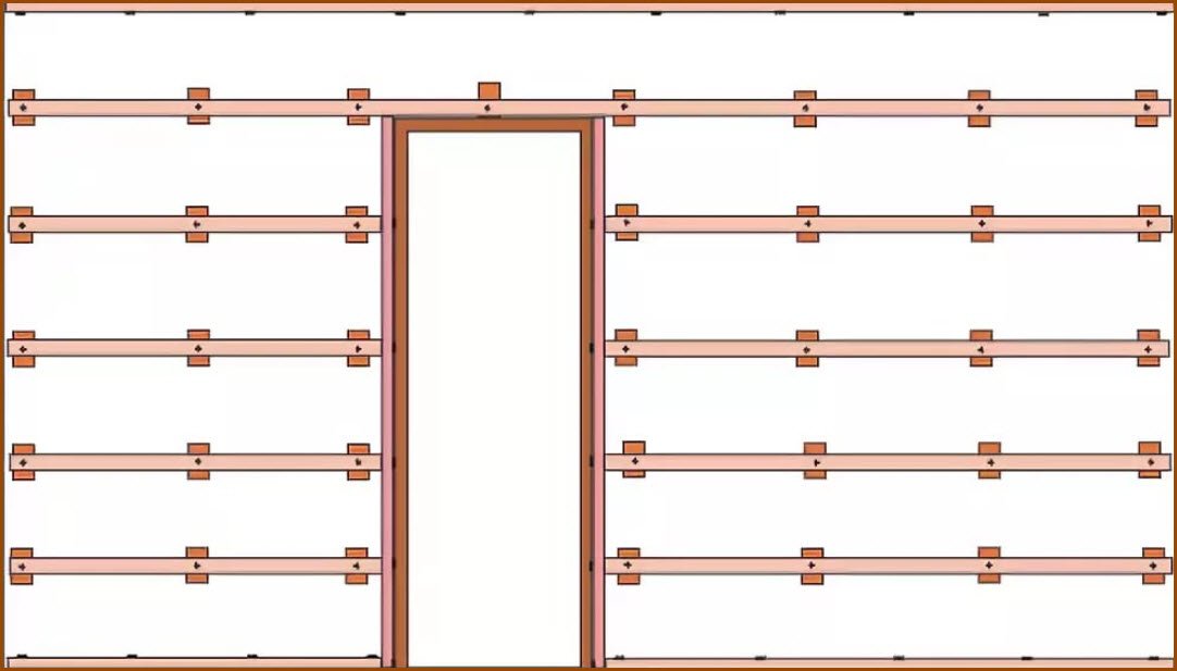 Estamos marcando Listones extremos: superior e inferior se ubicarán a una distancia de 6-7 cm del piso y el techo. Marcamos el techo de la misma manera. Los rieles de rodamiento deben instalarse perpendicularmente a las láminas, que pueden instalarse vertical, horizontal o diagonalmente. El escalón es de 40-50 cm.