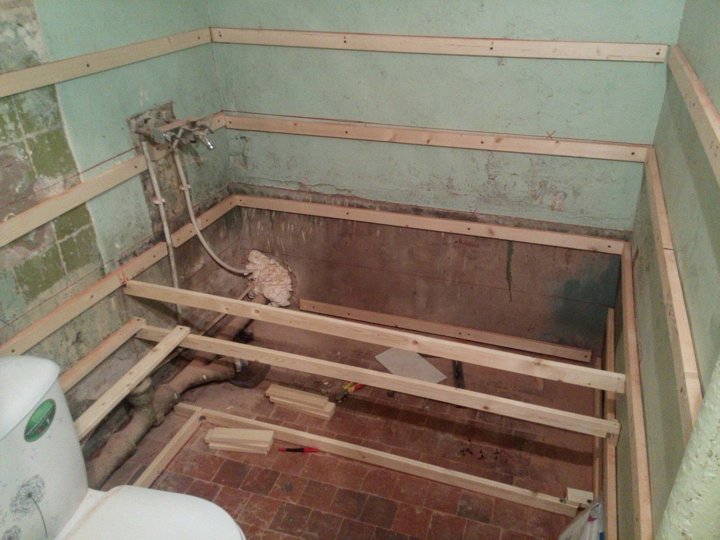 Si el inodoro tiene paredes irregulares, primero tendrá que preparar el marco de la caja y colocarle paneles con tornillos autorroscantes, kleimers o grapas.