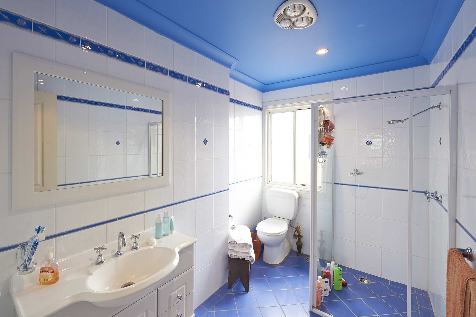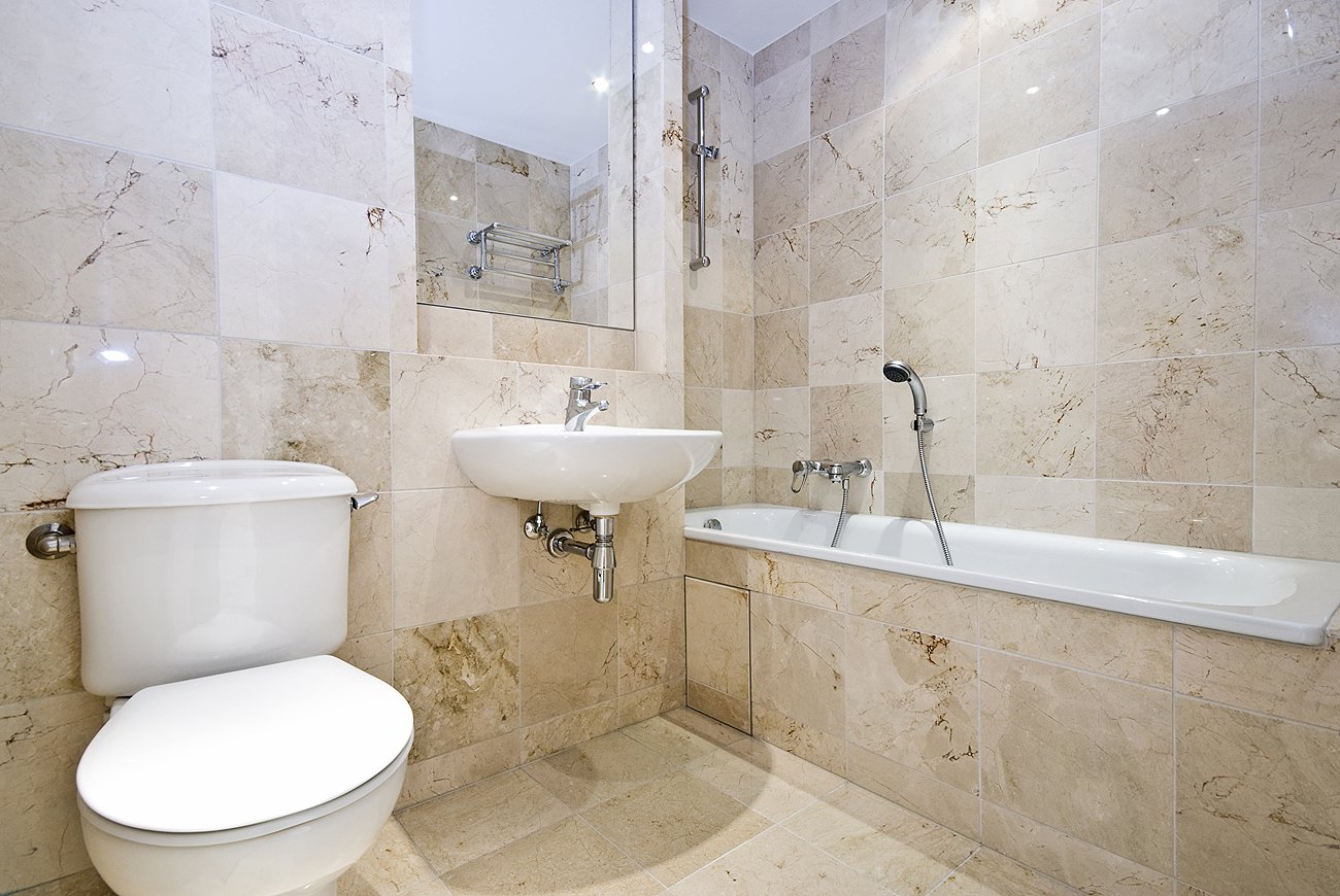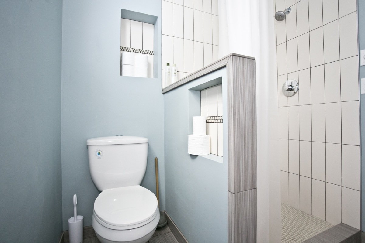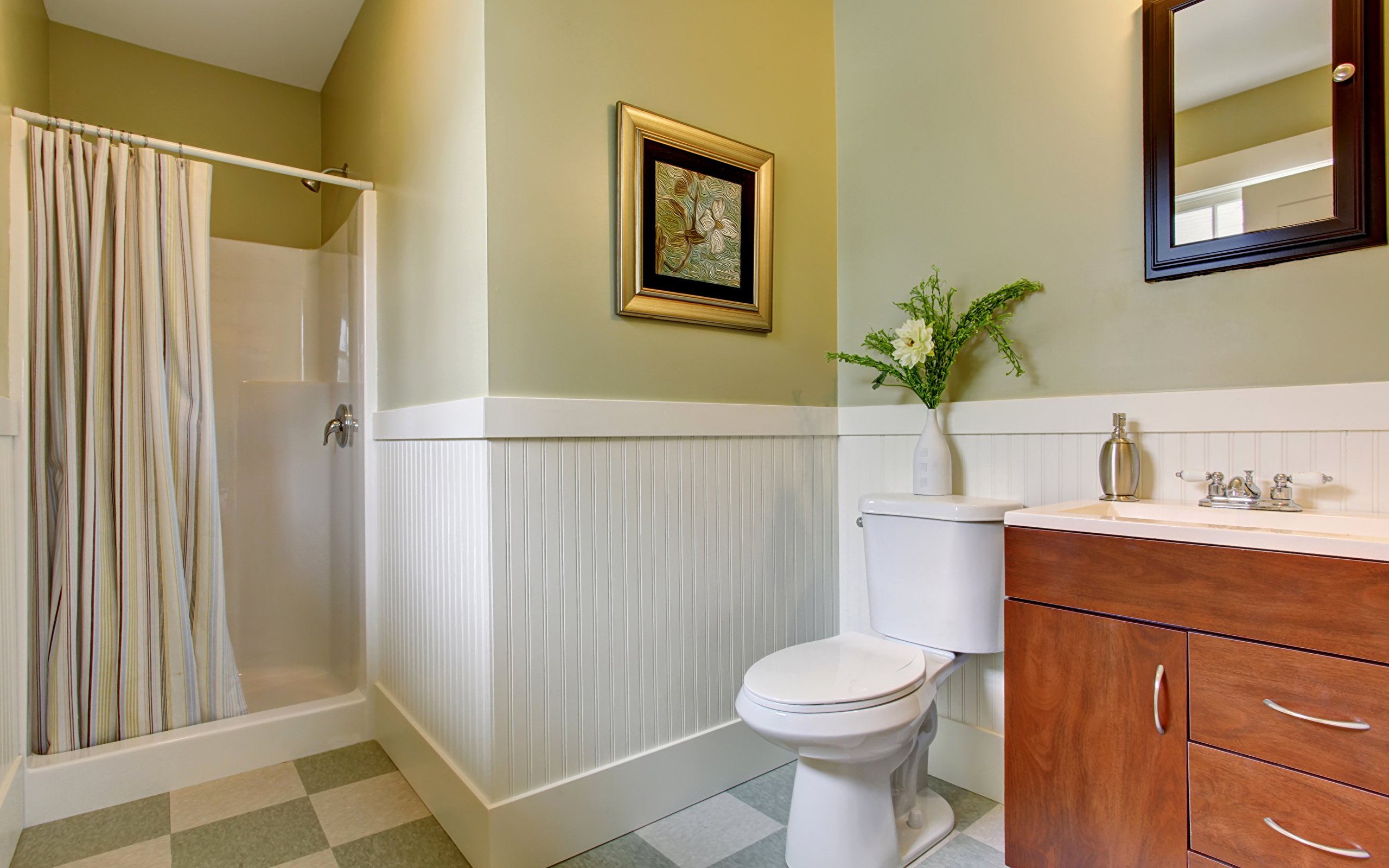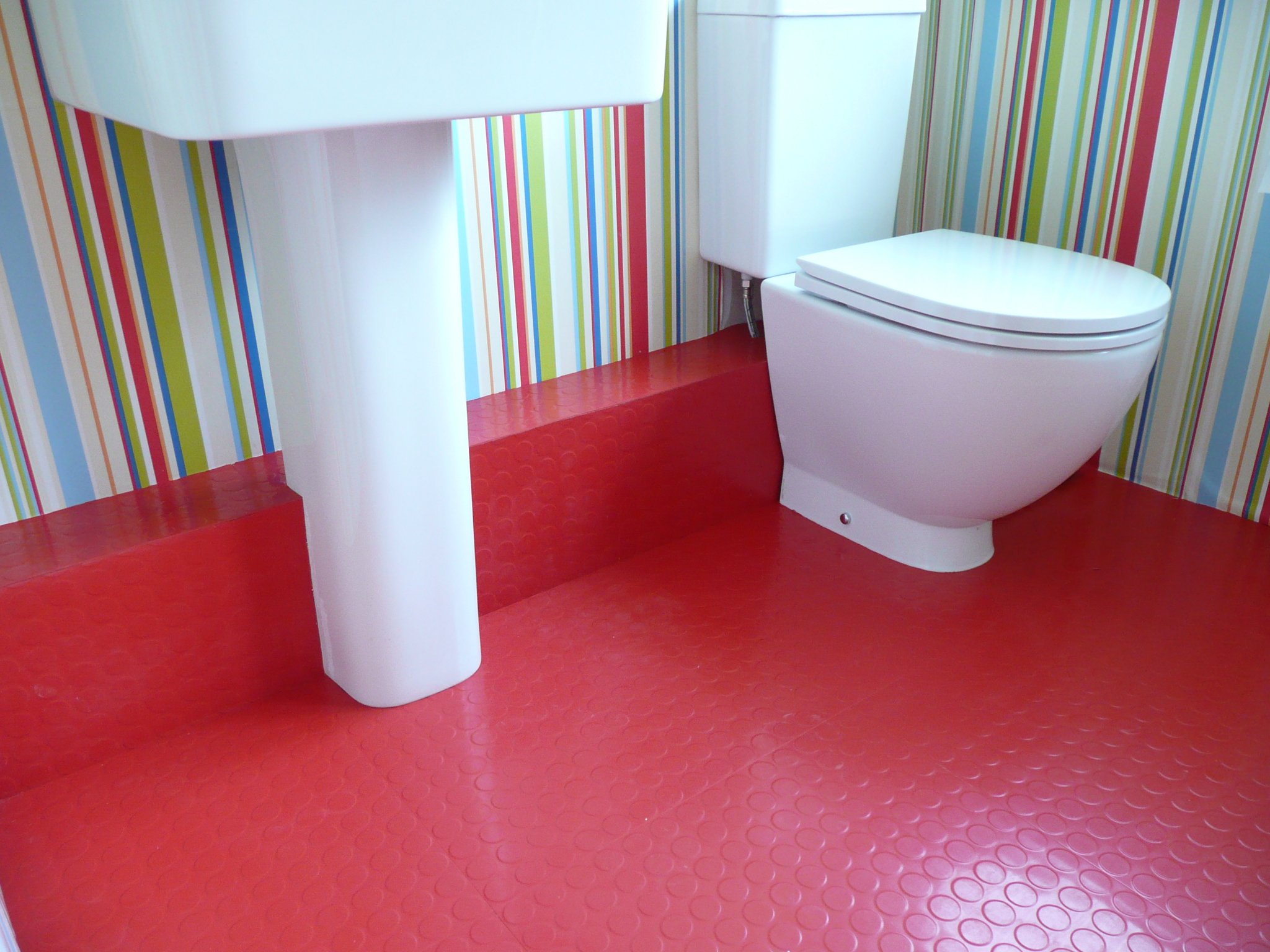 El baño no instala muebles que dejen huellas en el piso, por lo que el linóleo no tiene inconvenientes.