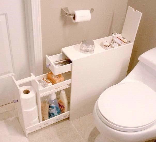 En un área limitada, se prefieren muebles y equipos aerodinámicos. Los estantes de las esquinas y los estuches para lápices, los gabinetes colgantes con puertas correderas son adecuados. Los estantes, en los que se almacenan los productos químicos domésticos y el papel higiénico, ahorran espacio. Los nichos hechos a sí mismos están decorados con mosaicos. El gabinete sobre la instalación puede consistir en estantes abiertos o cerrados por fachadas de marco. Se puede hacer un amplio espacio de almacenamiento bajo pedido, teniendo en cuenta las dimensiones de la pared y el inodoro.