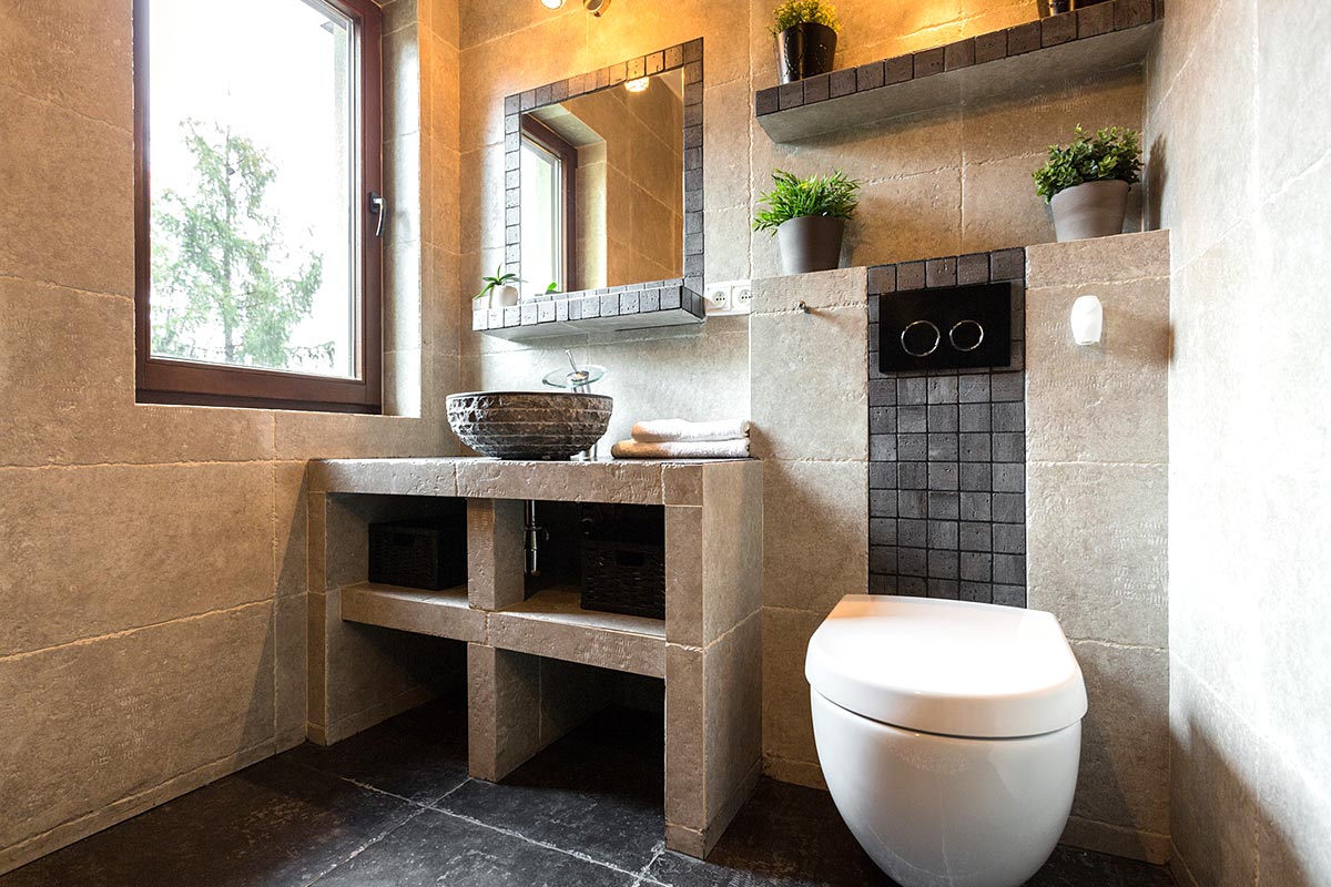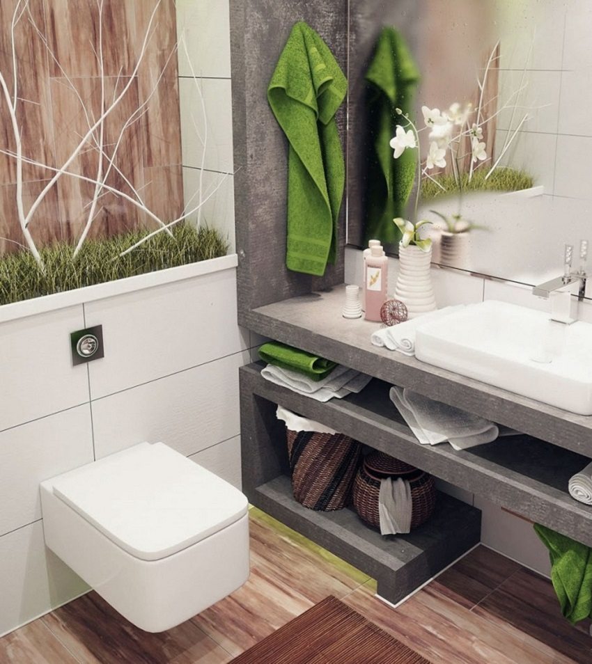 El baño en estilo ecológico está diseñado en tonos de cielo, tierra, hierba, sol, en habitaciones pequeñas se utiliza el color blanco como base.Las superficies se enfrentan con azulejos, madera, laminado, papel tapiz con motivos florales. El techo está pintado o revestido con paneles de corcho. La pared detrás del inodoro o las puertas del gabinete sanitario está hecha de revestimiento.