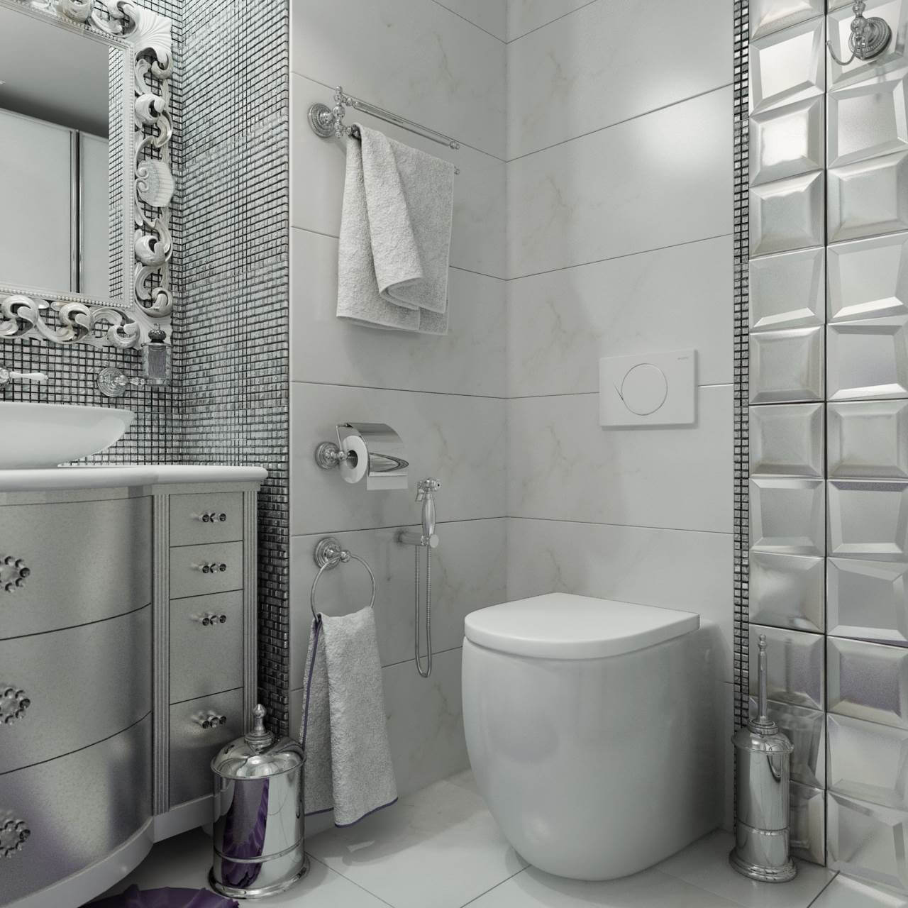 El estilo de alta tecnología se expresa en equipos de plomería modernos, superficies brillantes, buena iluminación. El efecto del espacio es creado por azulejos blancos en las paredes, luces de techo, plata, accesorios de vidrio.