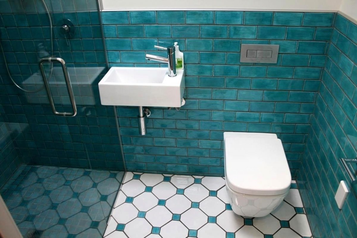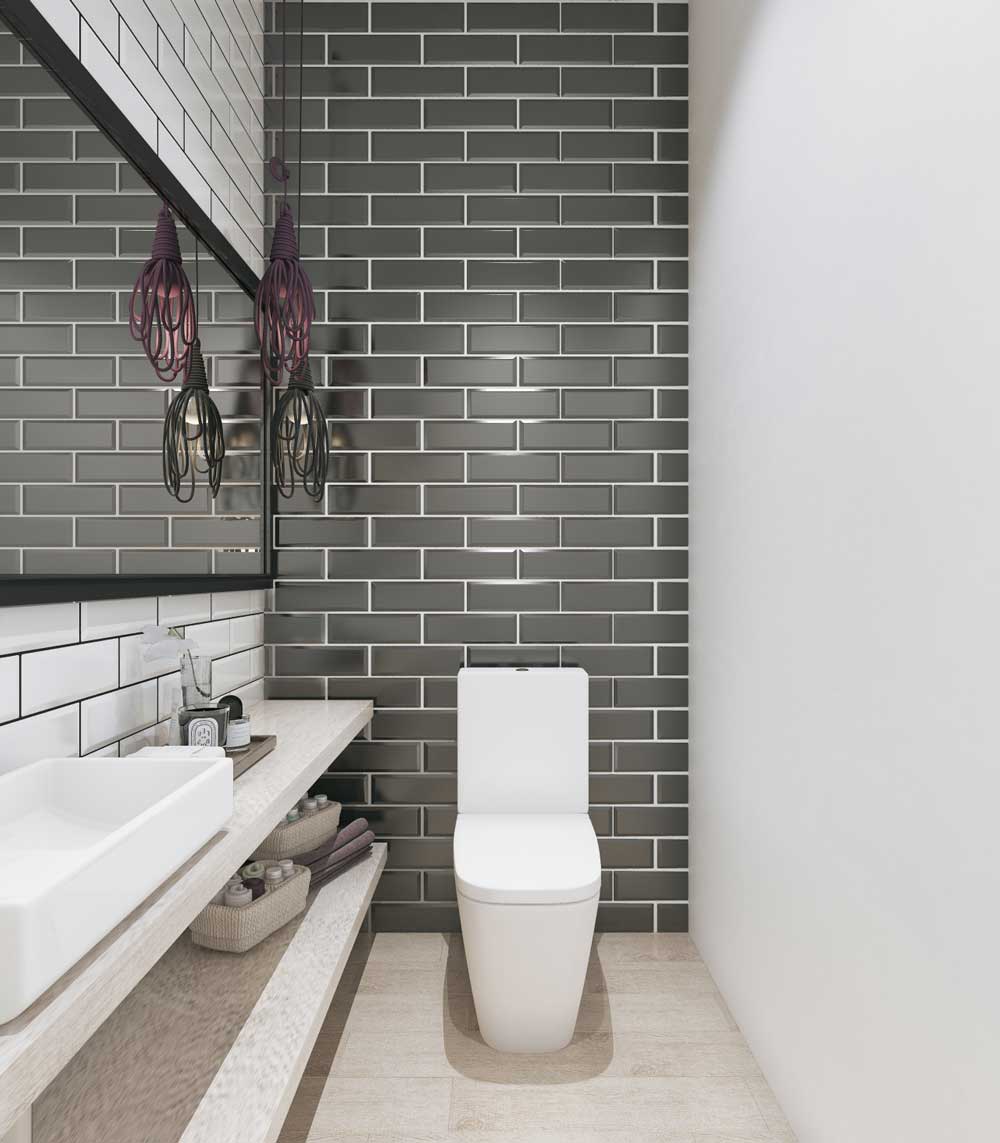 En habitaciones pequeñas, el gradiente de mosaico debe ir de un fondo oscuro a un techo claro. El mosaico de píxeles (una combinación de varios colores en un orden caótico) le da dinamismo y brillo al interior. Para simular ladrillos en el baño, se utilizan baldosas.Es deseable rodear la pared de acento o la parte inferior con rectángulos volumétricos con un chaflán de extremo biselado. El jabalí encaja en el estilo escandinavo, loft, minimalismo. Las baldosas cerámicas son inmunes a la humedad y al vapor, los productos de limpieza se pueden usar para terminar inodoros y duchas combinados. Con la elección correcta de tonos, los mosaicos no tienen inconvenientes.
