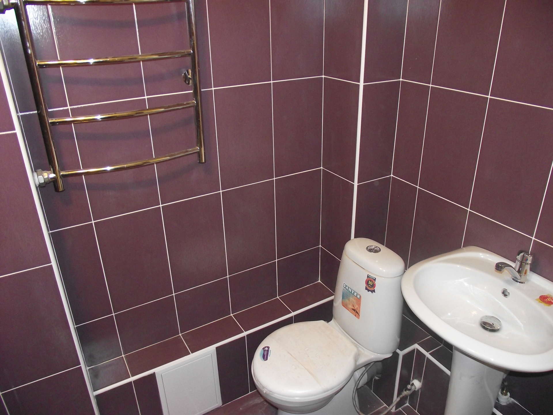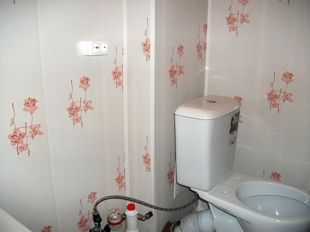 Los paneles de PVC a un costo mínimo ayudarán a limpiar el inodoro y crear un ambiente agradable. Las láminas se montan rápidamente en una pared o caja, enmascaran tuberías, metros. Material ligero enfundado en superficies en mal estado. Para un inodoro pequeño, obtienen paneles de pared no demasiado anchos con un patrón de tamaño mediano. El revestimiento no teme la humedad, los productos de limpieza, los rasguños.El revestimiento de vinilo no se pudre, no le teme al agua directa, se limpia con una esponja.