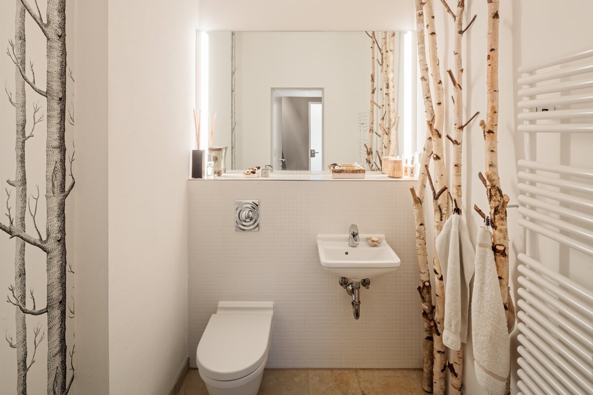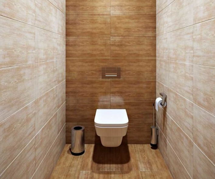 La decoración de paredes de madera, haciendo eco en el piso de tablones, ennoblece el espacio, adecuado para revestir inodoros espaciosos en hogares privados. El revestimiento se puede pintar al tono de los accesorios de plomería, combinado con pintura, yeso. Las molduras de madera en tonos claros alrededor del perímetro expanden visualmente las paredes. Las laminillas de color marrón o gris oscuro, colocadas en la pared de acento con un método de parquet, agregarán profundidad y enfatizarán la blancura del inodoro. El revestimiento blanco en combinación con superficies enlucidas o papel tapiz gris claro es apropiado en el estilo escandinavo. La abundancia de madera en un baño pequeño causa molestias, el revestimiento se usa solo para la decoración combinada. Por ejemplo, la pared posterior de listones transversales de tonos marrones en combinación con yeso liso y un piso laminado se ve original. En la casa de campo, un baño separado se puede revestir completamente con madera.