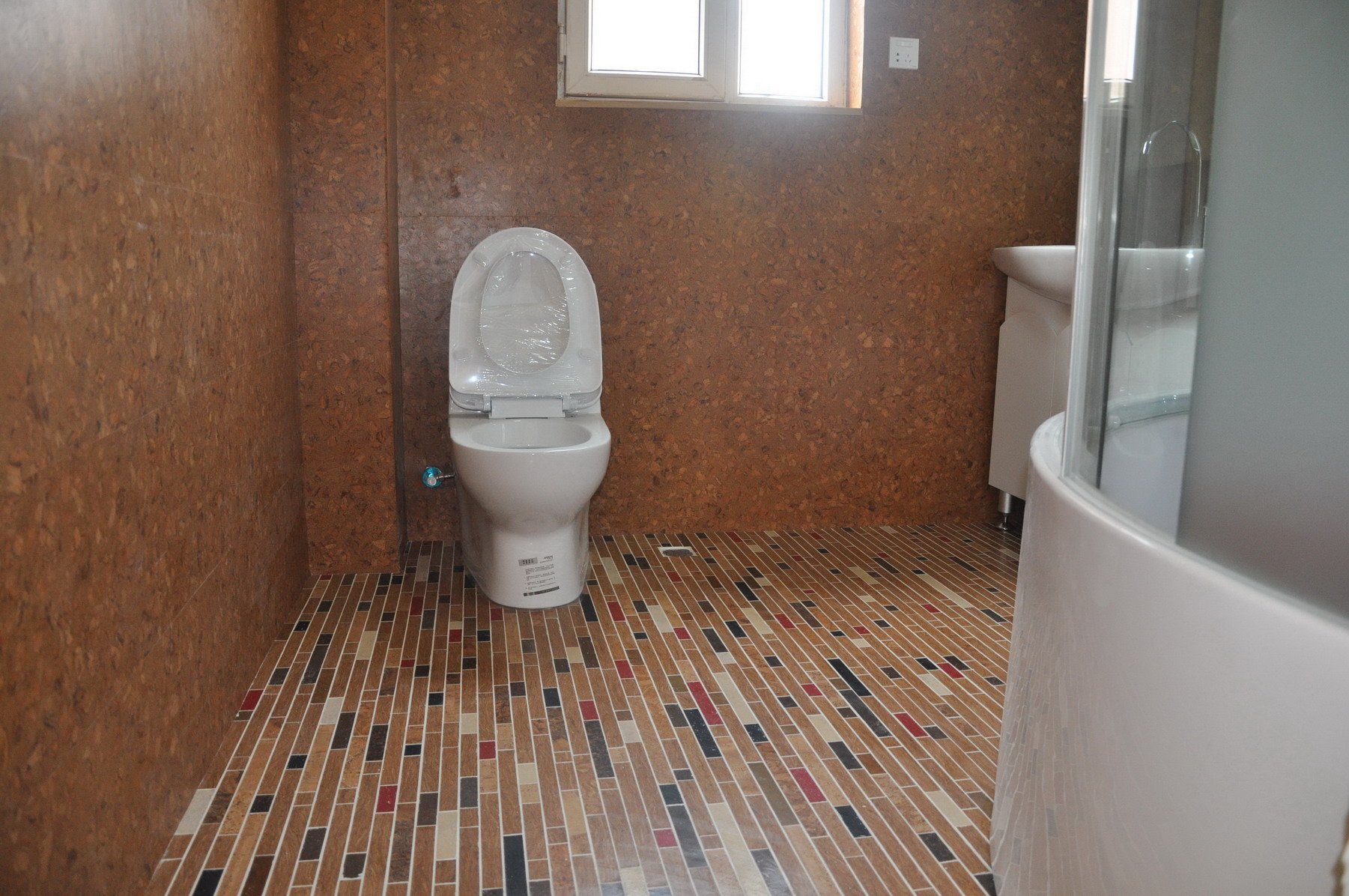 Para terminar el techo en un inodoro separado, se utilizan paneles de corcho blanco. La textura original del corcho se combina con el yeso, el revestimiento sirve durante mucho tiempo, dando a la habitación un aspecto costoso. El corcho no interfiere con el intercambio de aire, no teme a las fugas, se seca rápidamente y restaura la forma. Con contacto constante con el agua, se hincha y colapsa.