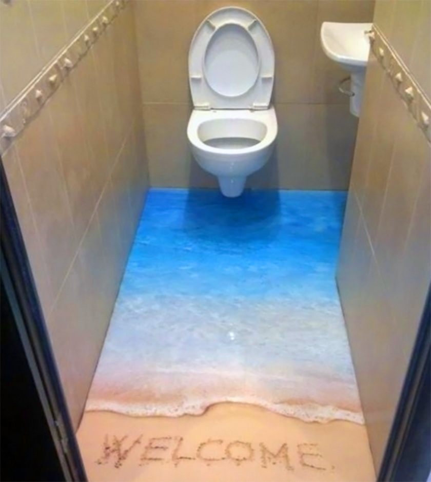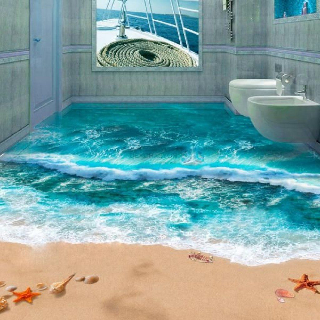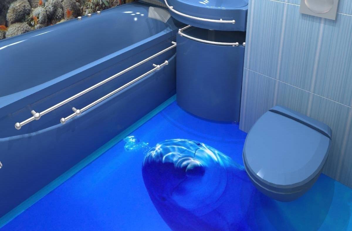La opción es adecuada para aquellos que quieran sorprender con un diseño inusual. El piso 3D en una habitación pequeña costará poco dinero, cree una imagen tridimensional, lo que complacerá la novedad. Revestimiento monolítico impermeable, adecuado para un inodoro combinado con una ducha o bañera. El piso autonivelante se crea solo sobre una base de concreto, para evitar fugas de la mezcla, las grietas y grietas se cierran cuidadosamente en la superficie. El revestimiento rugoso suelto y suave se desmantela al nivel de las losas. La tecnología de fundición, en comparación con los pisos de linóleo o baldosas, es compleja. Se aplica una capa de nivelación y acabado, el polímero y las composiciones epoxídicas se endurecen durante 2-6 días.