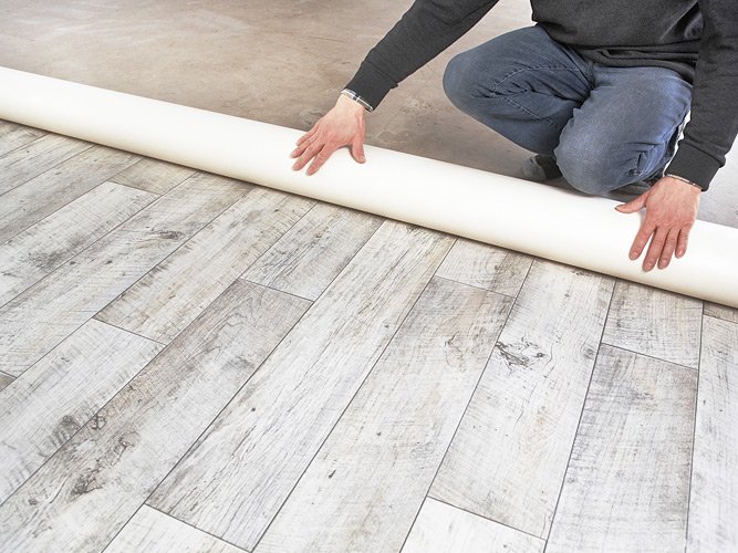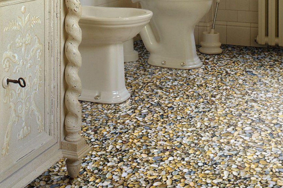 Linóleo doméstico o semi-comercial imita azulejos, piedra, laminado, reemplaza exitosamente revestimientos costosos. En el inodoro combinado, se recomienda elegir un material a base de espuma. El recubrimiento resiste la limpieza frecuente, la exposición a productos de limpieza. Las marcas y manchas húmedas no son visibles en la superficie. En una habitación pequeña, el linóleo se coloca en una sola pieza, cuidadosamente recortado con un cuchillo, fijado a la mezcla de pegamento.