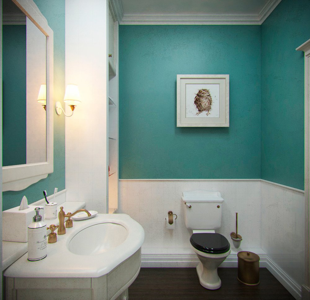 Pintar la parte superior de la pared en blanco y la parte inferior en tonos pastel expandirá visualmente los límites del inodoro. Para que la habitación no sea aburrida, elija tonos lila, limón, turquesa y verde primavera. El acabado tendrá un costo económico, pero la pintura enfatiza los defectos, debe trabajar duro en la preparación de la superficie de calidad, eliminar las esquinas irregulares. Inodoro separado teñido con composiciones acrílicas a base de agua.En el baño combinado, se agrega un aditivo que protege contra el moho a la pintura. Cerca del lavabo, los baños ponen un delantal de azulejos.