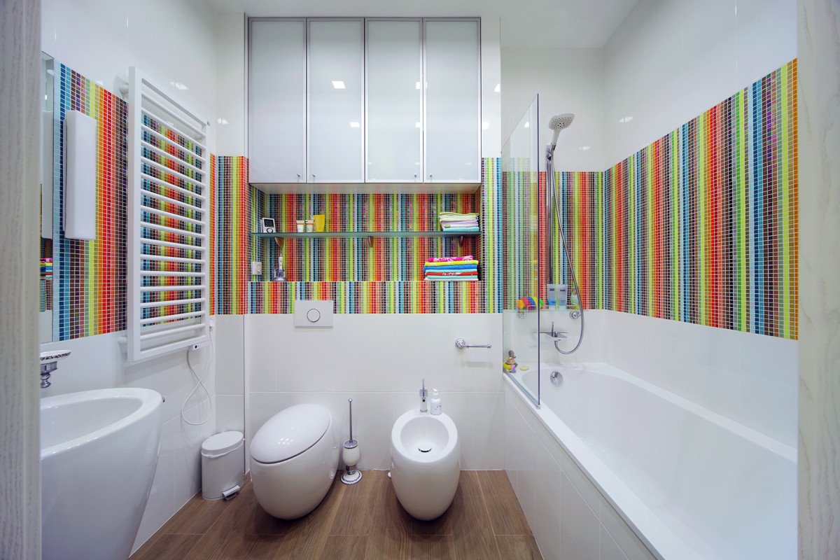 Para la decoración de paredes en un baño pequeño, se elige un azulejo de tamaño mediano. Para no estrechar la habitación, no debe estar demasiado oscura. La colocación de rayas horizontales con costuras notables se ve impresionante, expande el espacio. Rayas verticales extienden el techo. Las paredes están decoradas con detalles de diferentes tamaños, bordes, decoración abstracta, esquinas contrastantes, filas de acento. En el estrecho cuarto de baño al lado de la pared, forrado con azulejos lisos, el mosaico se ve hermoso. Las superficies brillantes y blancas como la nieve combinan mosaicos brillantes. Con la ayuda de mosaicos, se crean acentos en toda la pared, esquinas, bordes, estantes incorporados.