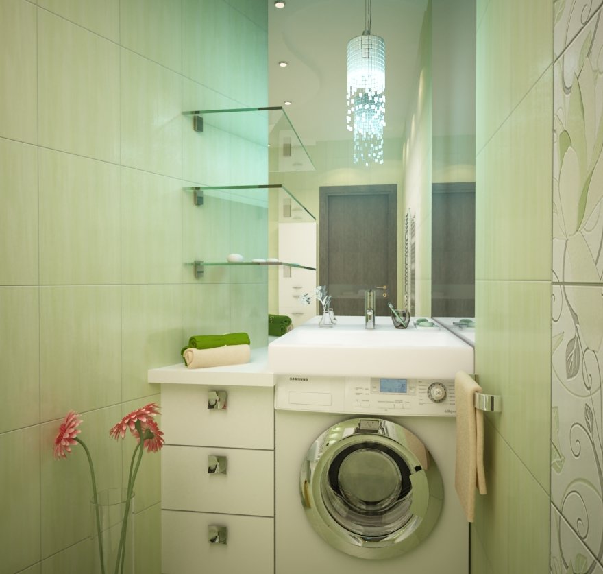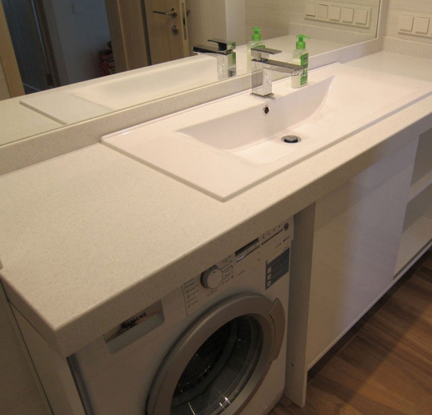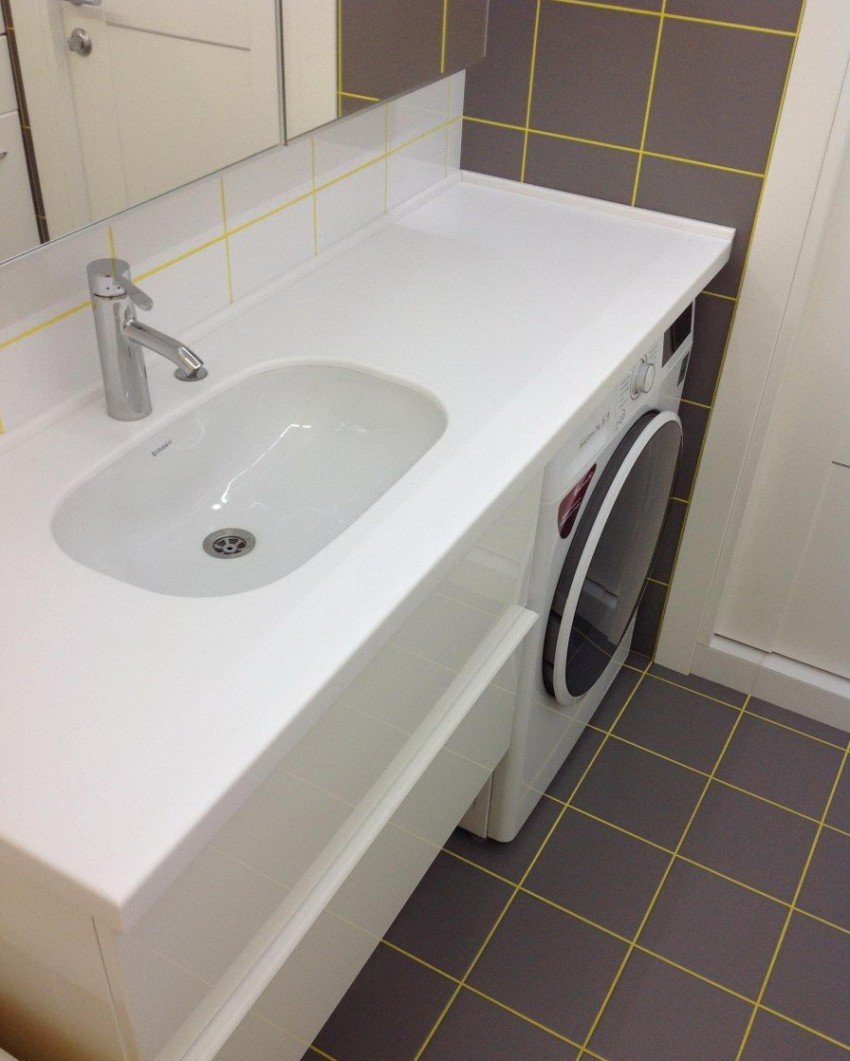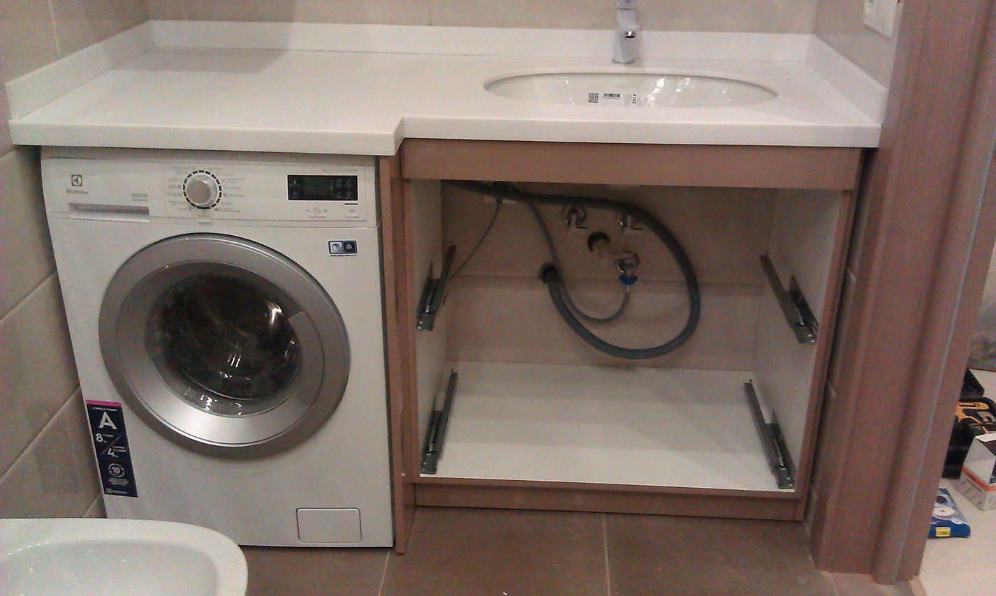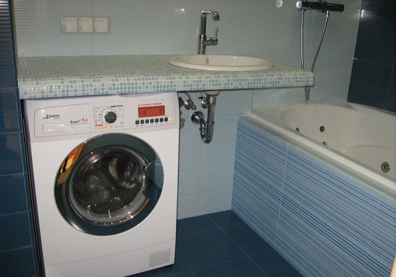 Un fregadero con encimera se considera una opción más segura. A continuación se forma un gran espacio, que ofrece una opción para una lavadora. Por razones de seguridad, se instala debajo de la encimera y el espacio debajo del fregadero, que se encuentra en el vecindario, está lleno de estantes,toalleros (una idea muy original) o un armario cerrado. La opción solo tiene un inconveniente significativo: el alto costo.