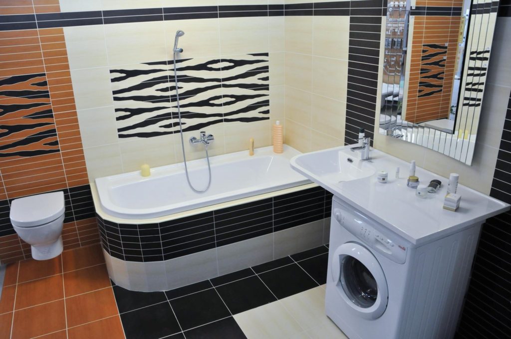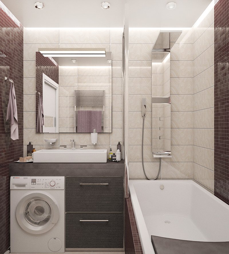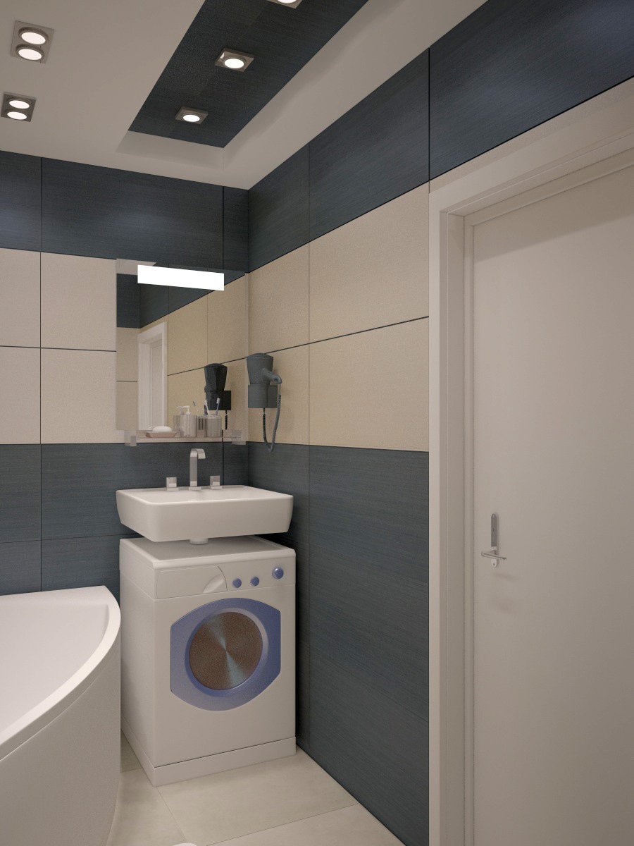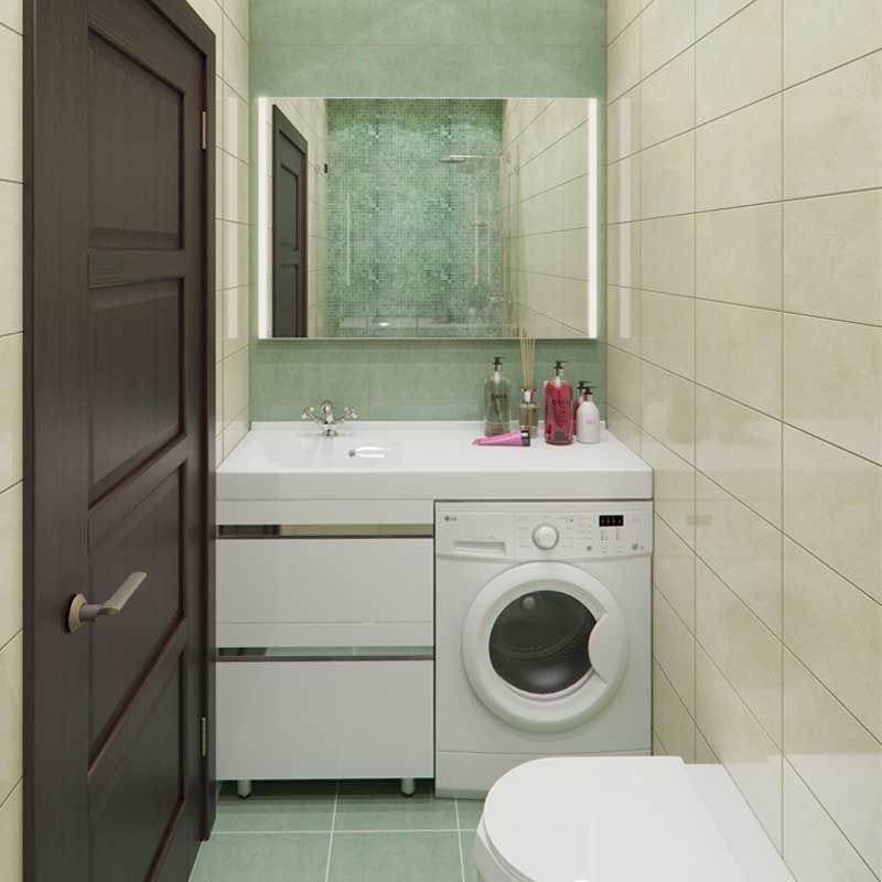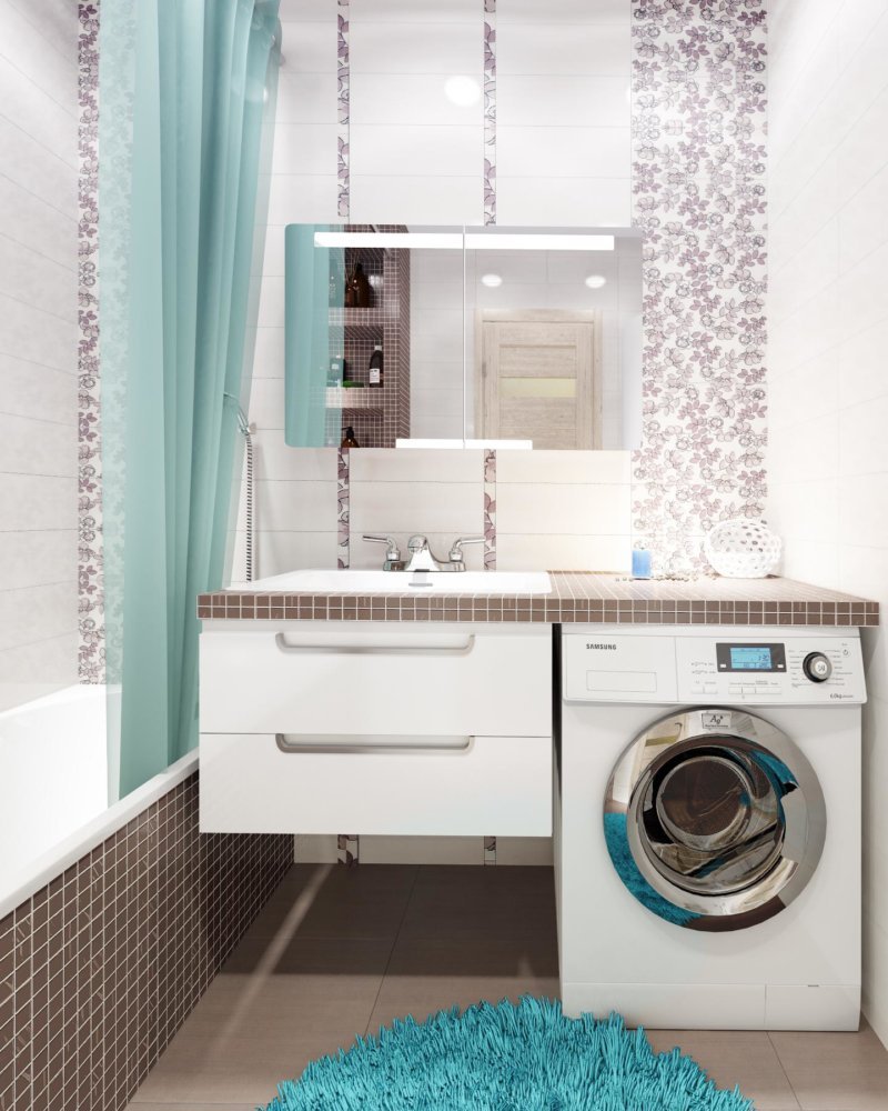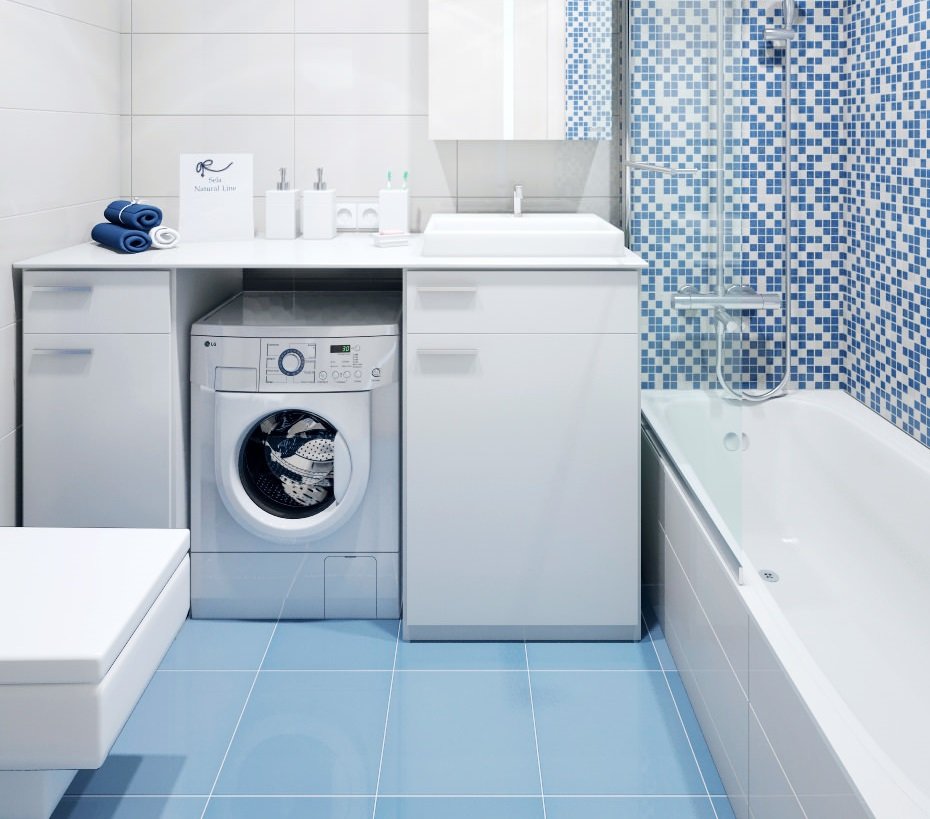 Un fregadero con encimera se considera una opción más segura. A continuación se forma un gran espacio, que ofrece una opción para una lavadora. Por razones de seguridad, se instala debajo de la encimera y el espacio debajo del fregadero, que se encuentra en el vecindario, está lleno de estantes,toalleros (una idea muy original) o un armario cerrado. La opción solo tiene un inconveniente significativo: el alto costo.