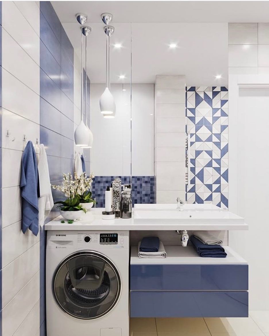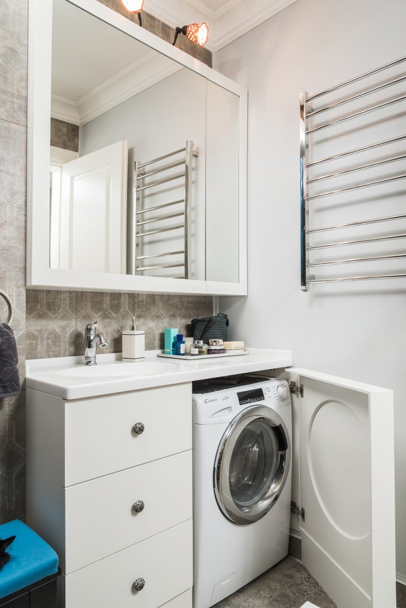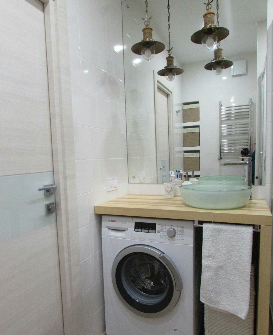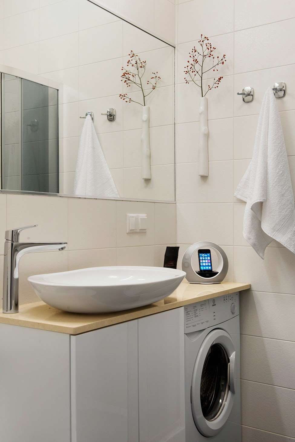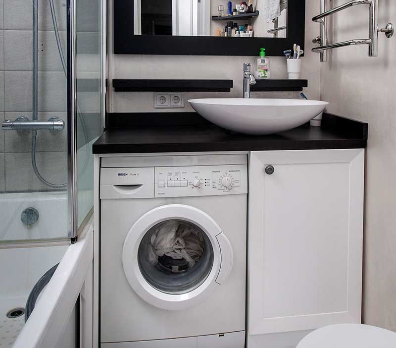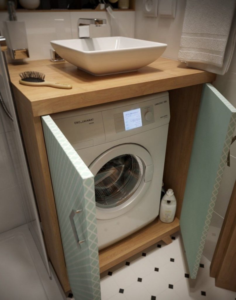Una lavadora debajo del fregadero es la mejor opción para apartamentos pequeños. En el interior del baño o la cocina, esta solución parece bastante fresca e inusual. Si la composición del tazón y el equipo se complementa con un espejo, un sistema de almacenamiento, un par de toalleros o un estante de madera estrecho, seleccionados correctamente por color y textura, entonces esta simbiosis se llenará de armonía y se convertirá en el punto culminante de la decoración de la habitación.