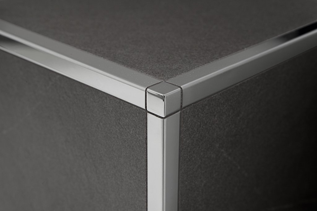 Un material versátil con muchas ventajas y un esquema de color clásico. Las esquinas de diferentes tipos de metal normalmente se combinan entre sí en el mismo interior, especialmente en la cocina y el baño. Los productos de metal son generalmente delgados y livianos, por lo que la integridad de la loseta durante el borde no se verá afectada.