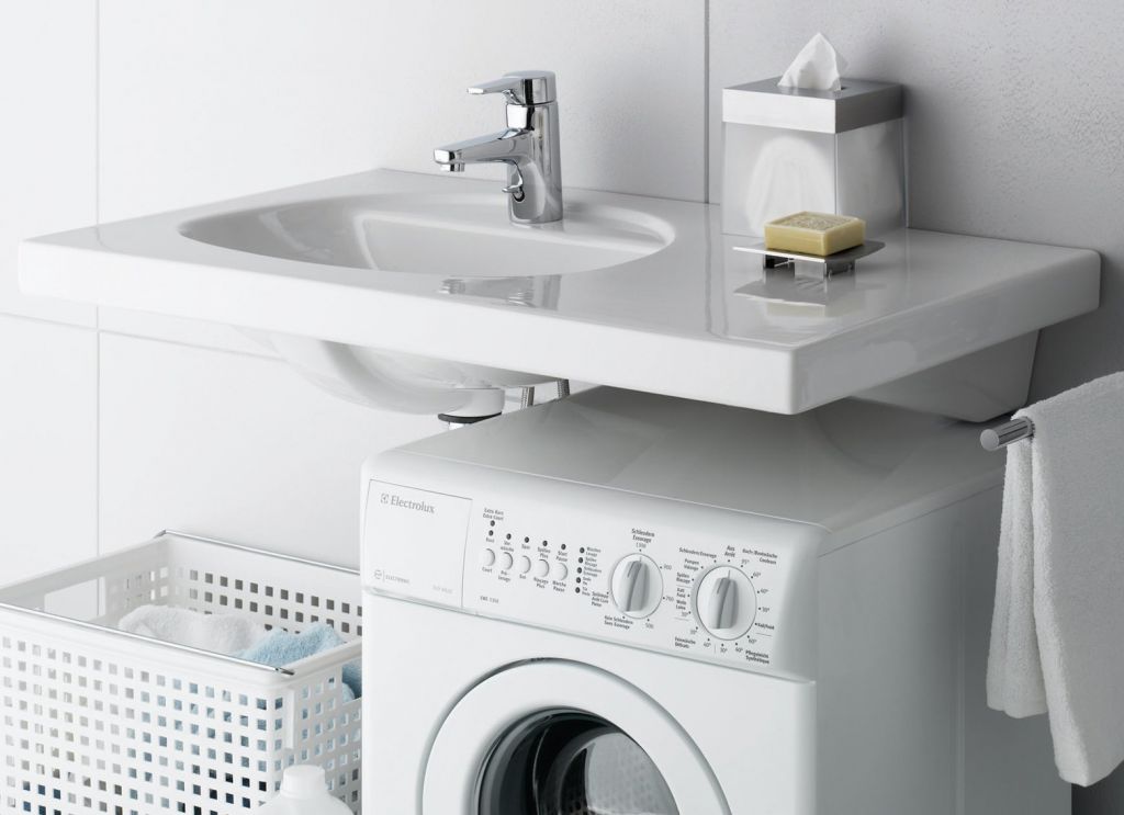 Una excelente solución para habitaciones pequeñas, baños compartidos. El objetivo principal de combinar una lavadora y un lavabo es ahorrar poco espacio. Este método le permitirá colocar todos los artículos necesarios en el inodoro o en el baño. A veces esto es simplemente necesario, ya que es imposible colocar el equipo en otras habitaciones.