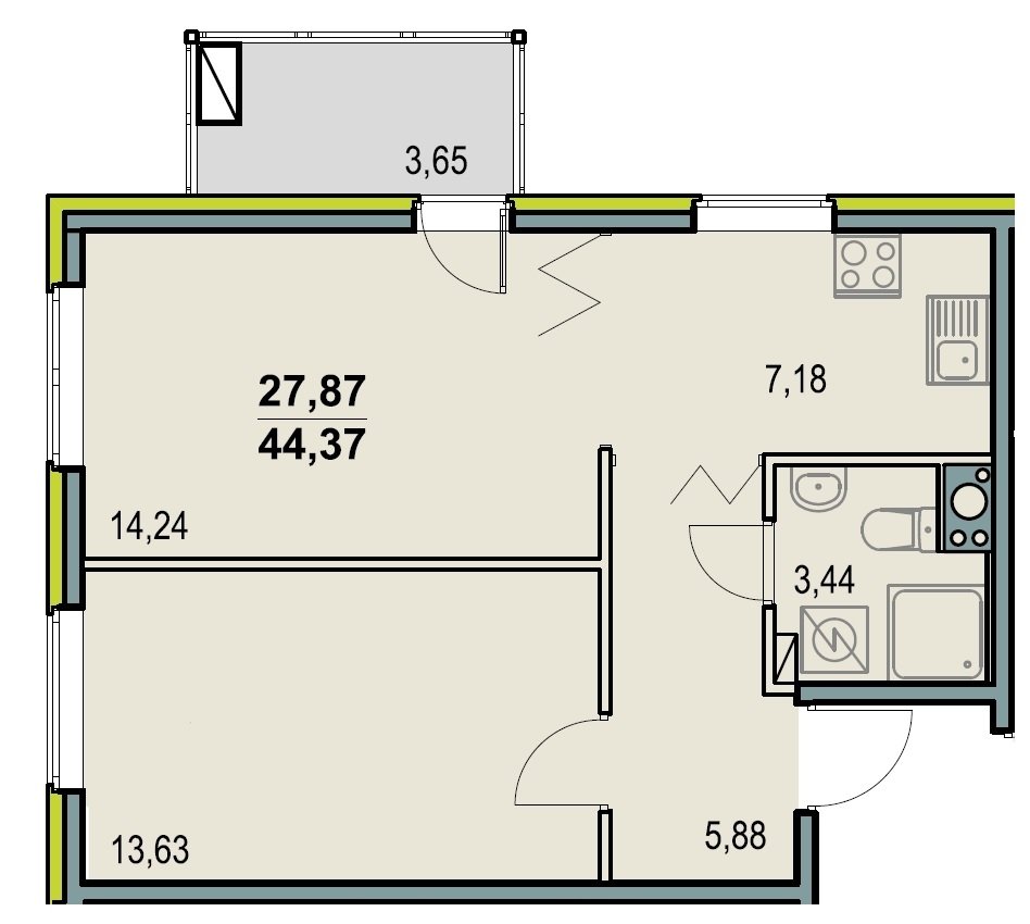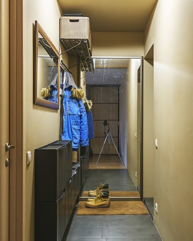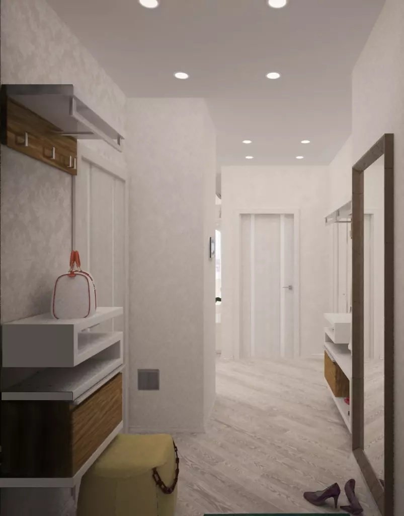 En apartamentos de una habitación con una superficie de 44 metros cuadrados. El papel del pasillo representa un pequeño corredor. La sala de entrada está conectada por puertas internas a la sala de estar, baño, cocina y dormitorio. El inodoro y el baño se pueden combinar o separar. La mayoría de los edificios residenciales construidos en los años 2000 y 2010 tienen vestuarios. Además del espacio habitable en estos apartamentos, hay una logia o balcón (más de 3 metros cuadrados). Alrededor del 40% está ocupado por la sala principal, la sala de estar (19-20 m2). La cocina es casi 2 veces más pequeña. Si el baño y el inodoro están juntos, el área total de dicha habitación será de aproximadamente 6 metros cuadrados. Esta es una carcasa muy compacta sin mayor comodidad. Puede hacerlo más conveniente expandiendo instalaciones como la sala de estar y la cocina. El espacio alrededor del pasillo se puede guardar reemplazando las puertas con el móvil.