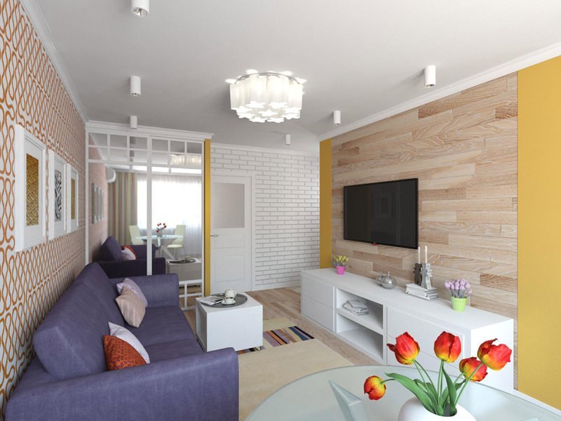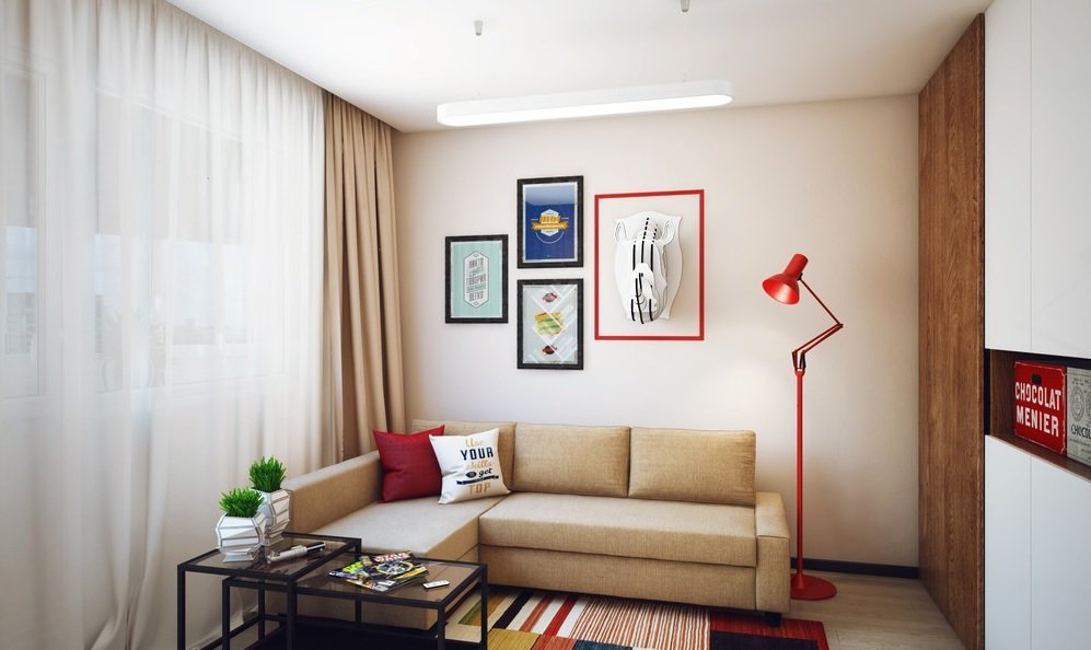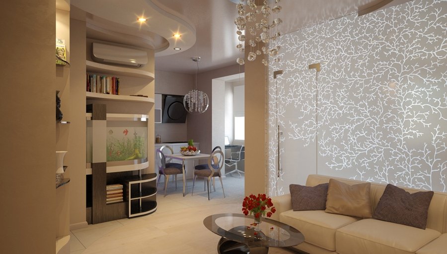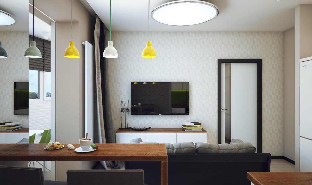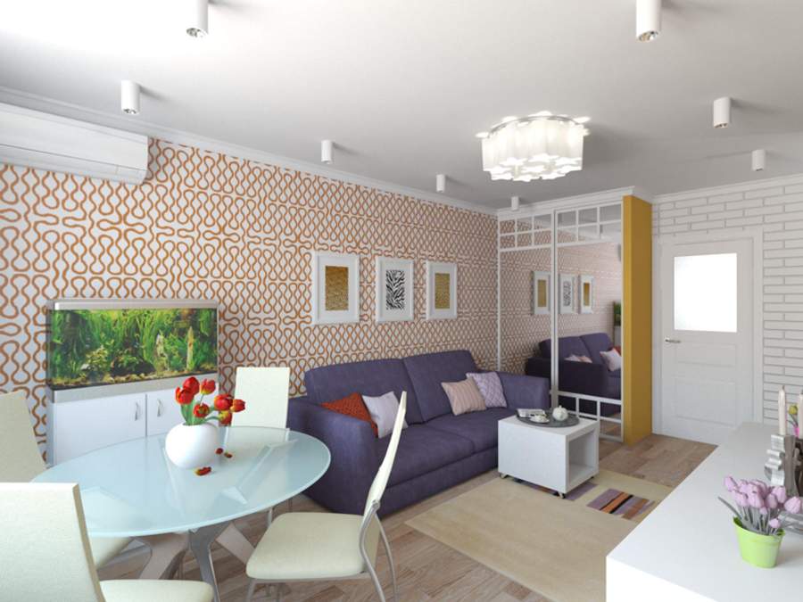 La sala de estar debe distinguirse del resto de las habitaciones. La solución óptima sería crear un esquema de color contrastante. Se combinan tonos fríos y cálidos de paredes, muebles y alfombras. Puede resaltar el área de comedor en la sala de estar. Para su diseño, una mesa con una superficie transparente y sillas de metal son adecuadas. El fondo de pantalla brillante ayudará a aumentar visualmente el volumen. Los gráficos geniales se ven geniales. Para empapelar, es recomendable elegir solo una de las cuatro superficies verticales. La iluminación se deteriorará si se pegan dos paredes. Las cortinas finas y ligeras son adecuadas para la decoración de ventanas. Para guardar la ropa, puedes usar el armario con grandes espejos en las puertas. Al elegir una lámpara, debe prestar atención a su potencia.Un candelabro compacto es apropiado en un interior minimalista, y en otros casos, se debe dar preferencia a los dispositivos de iluminación grandes.