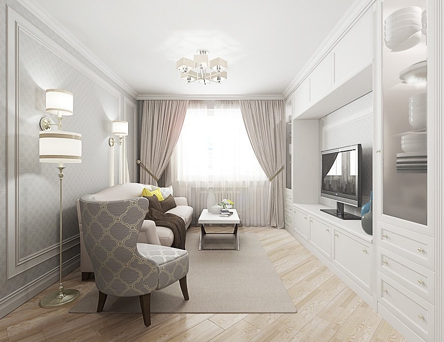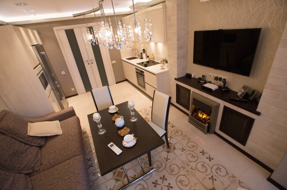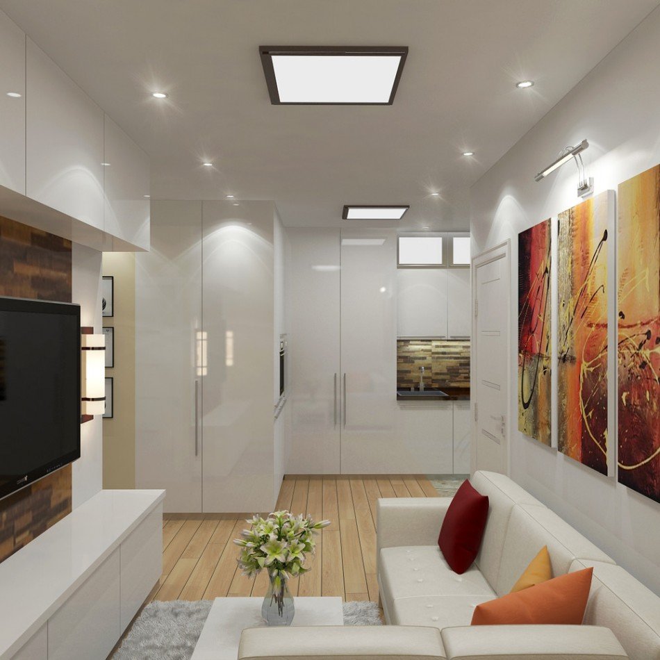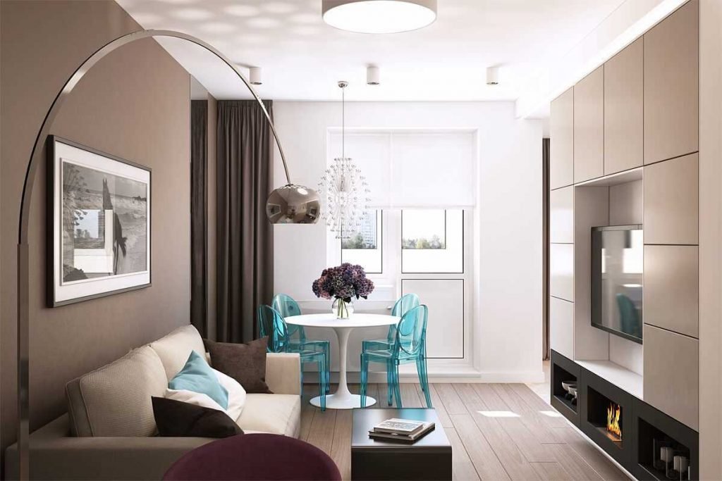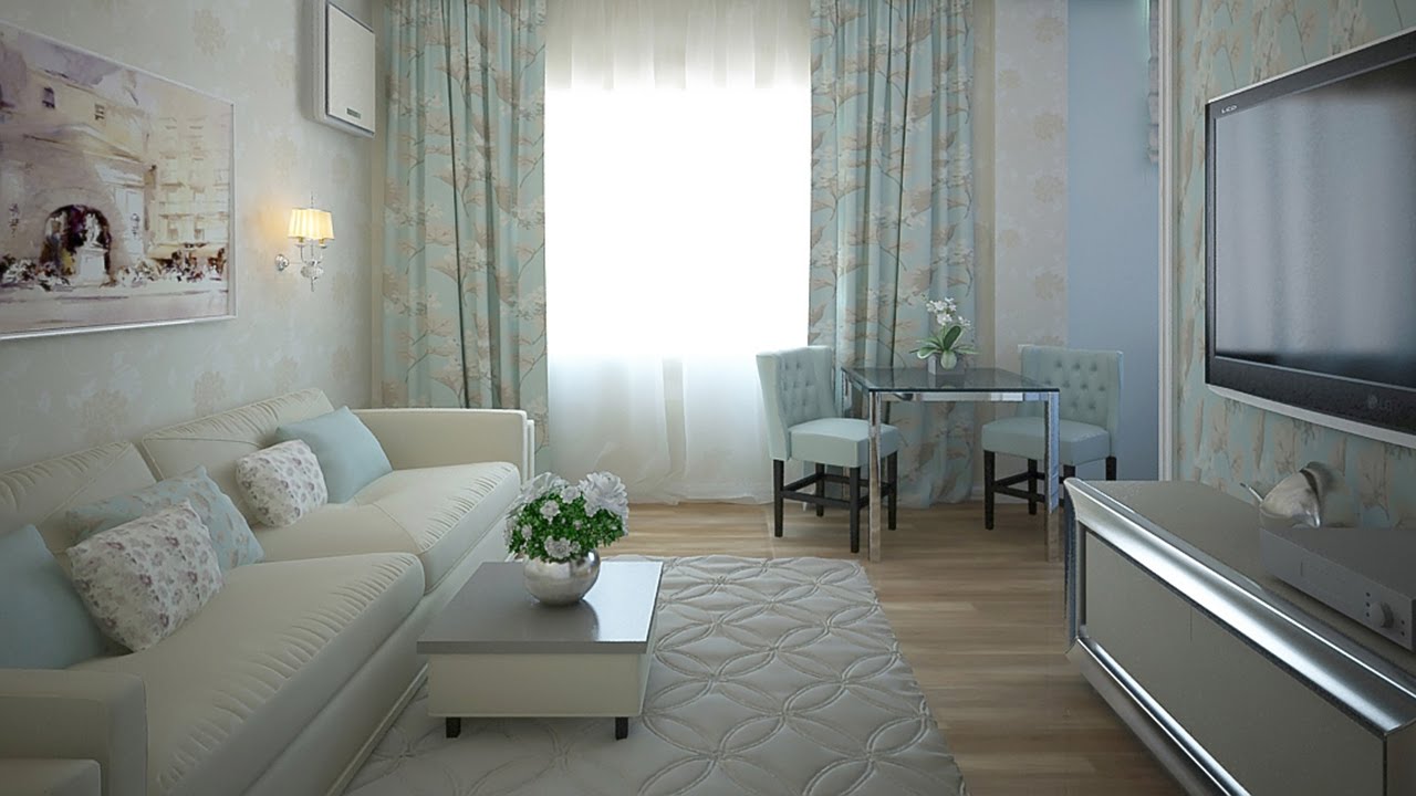 La sala de estar debe distinguirse del resto de las habitaciones. La solución óptima sería crear un esquema de color contrastante. Se combinan tonos fríos y cálidos de paredes, muebles y alfombras. Puede resaltar el área de comedor en la sala de estar. Para su diseño, una mesa con una superficie transparente y sillas de metal son adecuadas. El fondo de pantalla brillante ayudará a aumentar visualmente el volumen. Los gráficos geniales se ven geniales. Para empapelar, es recomendable elegir solo una de las cuatro superficies verticales. La iluminación se deteriorará si se pegan dos paredes. Las cortinas finas y ligeras son adecuadas para la decoración de ventanas. Para guardar la ropa, puedes usar el armario con grandes espejos en las puertas. Al elegir una lámpara, debe prestar atención a su potencia.Un candelabro compacto es apropiado en un interior minimalista, y en otros casos, se debe dar preferencia a los dispositivos de iluminación grandes.