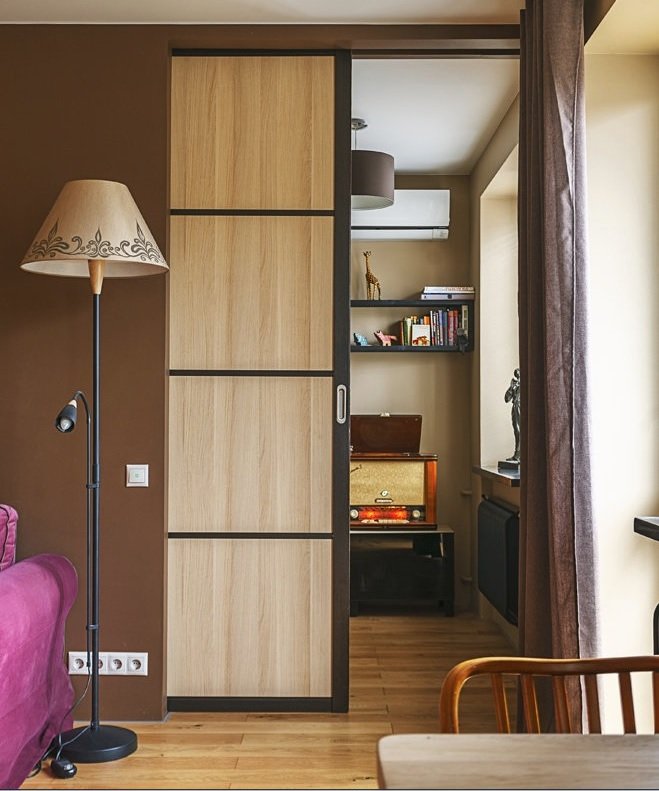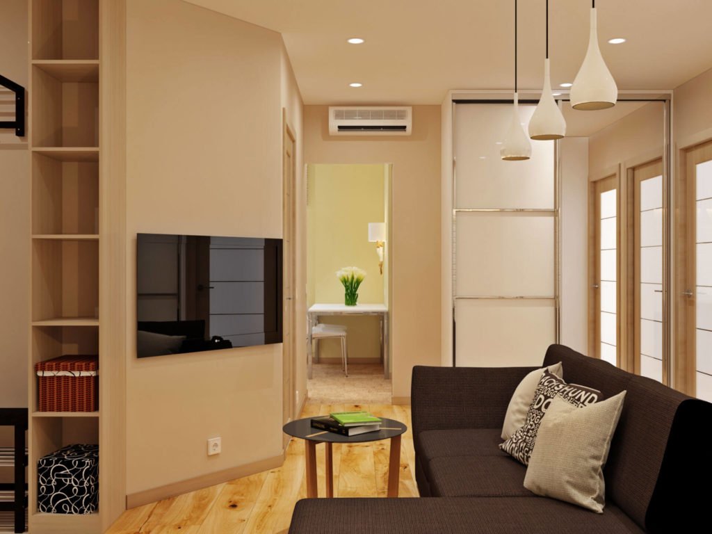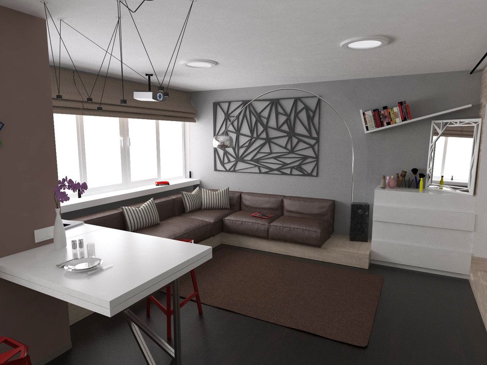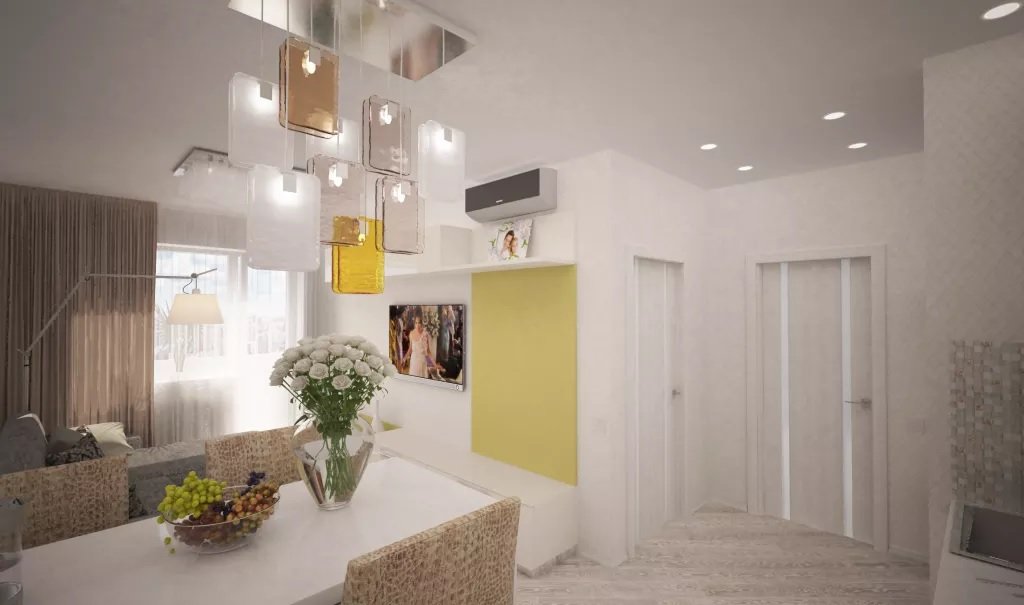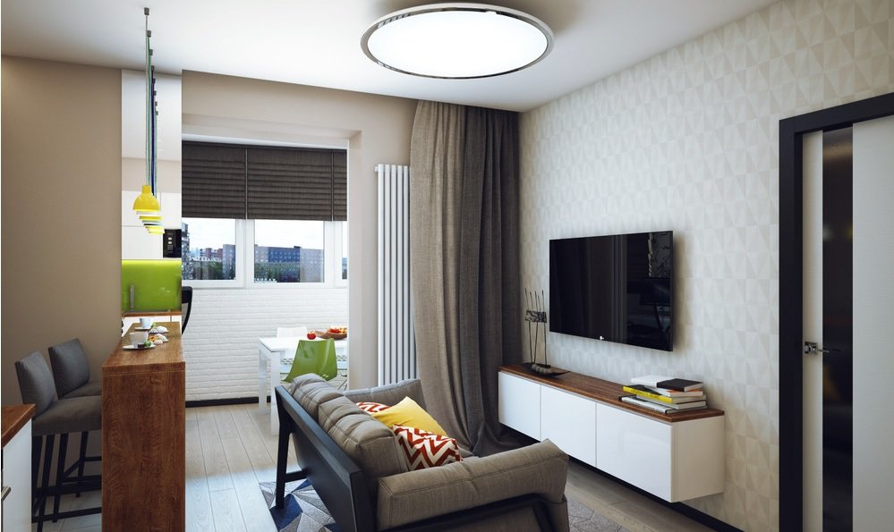 La solución estándar es aumentar el espacio para habitaciones, cocina o baños debido al hall de entrada. Será apropiado si no hay suficiente espacio en la sala de estar, dormitorio o baño para muebles o electrodomésticos. Vivienda pequeña con un área de 44 "cuadrados" se puede convertir en un apartamento tipo estudio. Ella se verá elegante y moderna; Expande visualmente el volumen de toda la habitación, mejora la microcirculación del aire. Si elimina algunas particiones, las habitaciones se destacarán como secciones separadas, cada una de las cuales contendrá sus propias partes funcionales. La zonificación entre la cocina y la sala de estar puede llevarse a cabo mediante diversos elementos del interior, como un juego de muebles, mesa, cocina o barra de bar. Se recomienda dejar una de las habitaciones separadas del espacio común. Esto se aplica a las familias que tienen un hijo.La salida del apartamento será en la sala de estar o en la cocina.