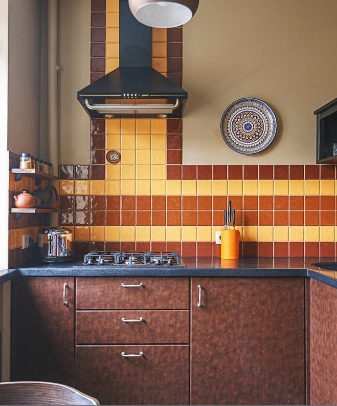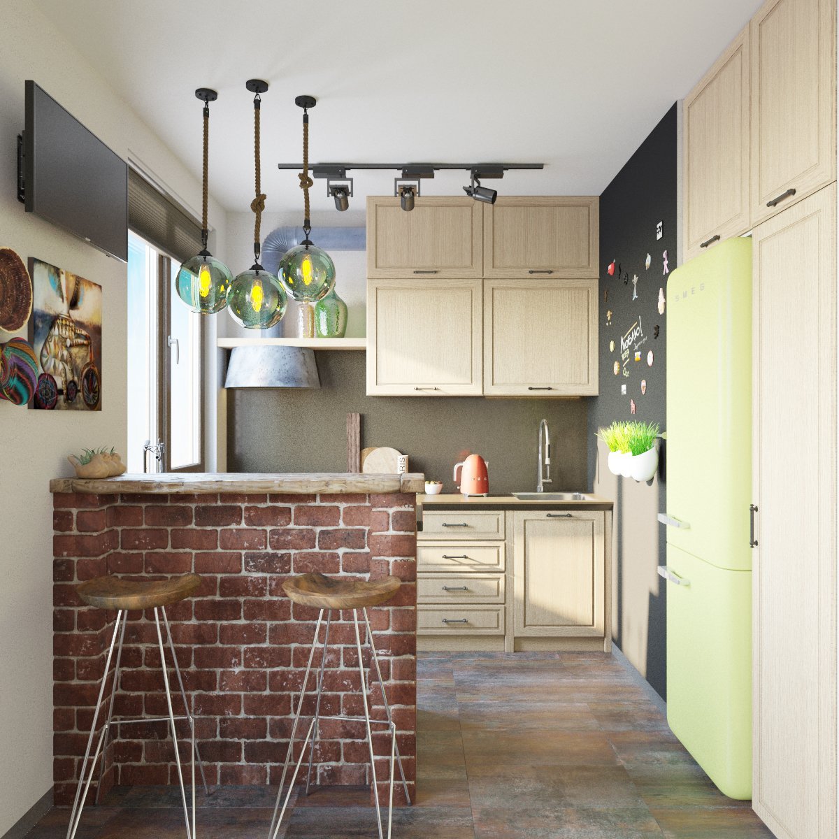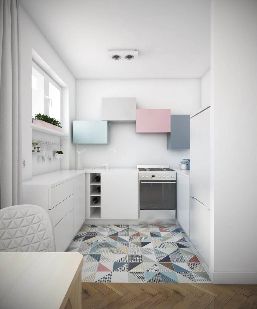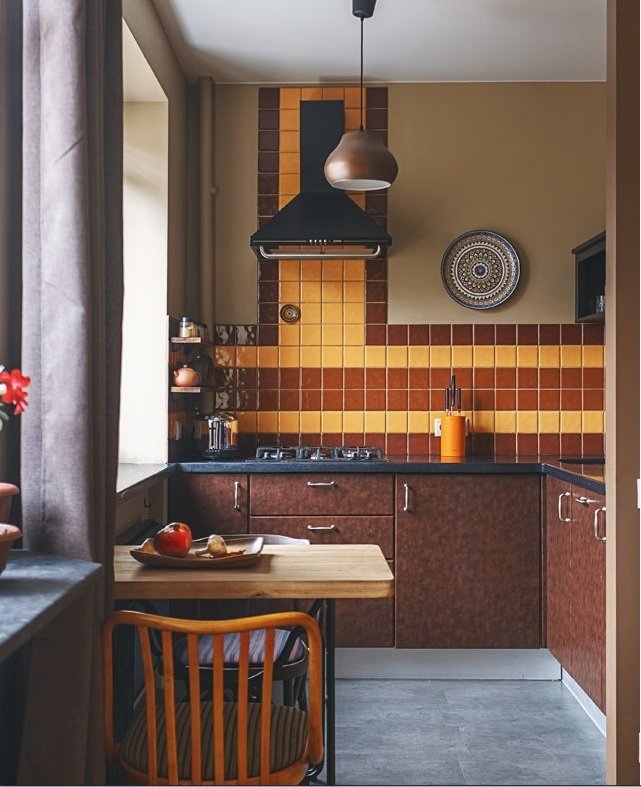 Mover el espacio de la cocina en el "Jruschov" y "Brezhnevka" es difícil. Las cocinas son oblongas y cuadradas. El pequeño tamaño de estas habitaciones sobrecarga enormemente el área con varios elementos. Para aumentar el espacio de las cocinas, se eliminan las particiones internas. Para una pequeña sala de cocina, es adecuada una pared con una configuración de madera clásica. Las fachadas de la cocina generalmente tienen tonos fríos, al igual que la cocina misma. Una combinación de uno de los colores espectrales y el blanco se ve hermosa. Es mejor terminar el piso con azulejos. Se ve bien la luz, pero no monótono. Una de las soluciones más interesantes es un dibujo en el centro de la habitación, creado por varios elementos en mosaico. En lugar de azulejos, se puede usar un laminado. El piso a veces se hace aislado. La ventana de la cocina está colgada con un tul corto y delgado para no degradar la luz.