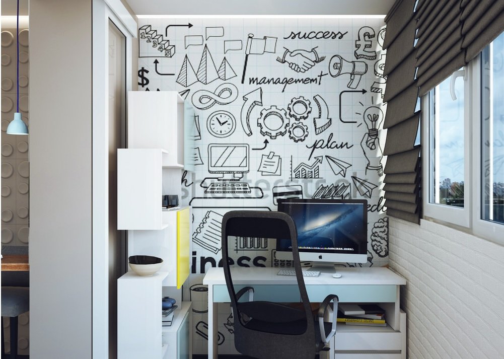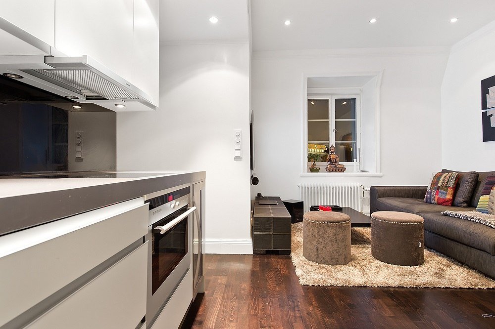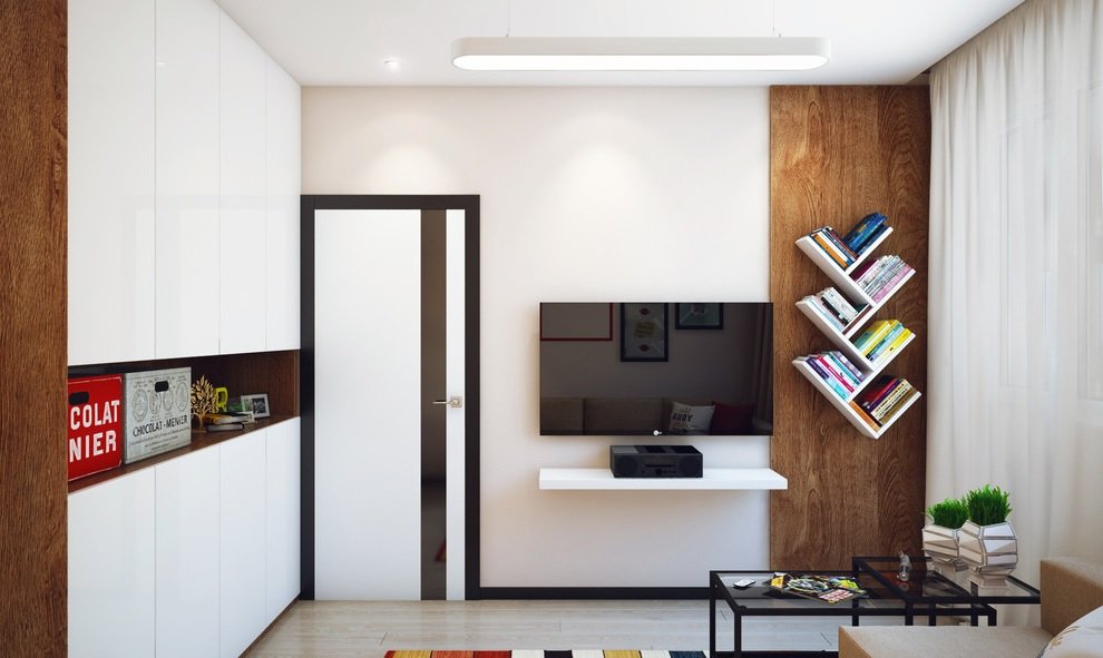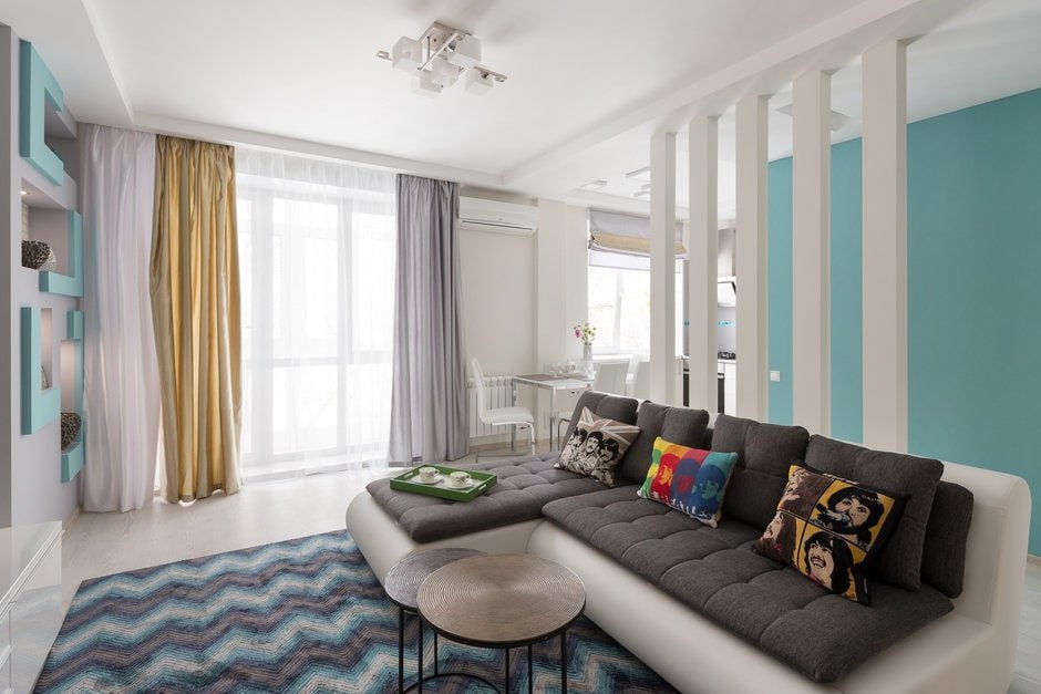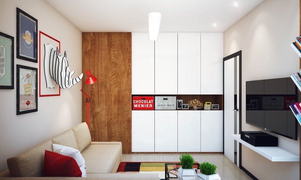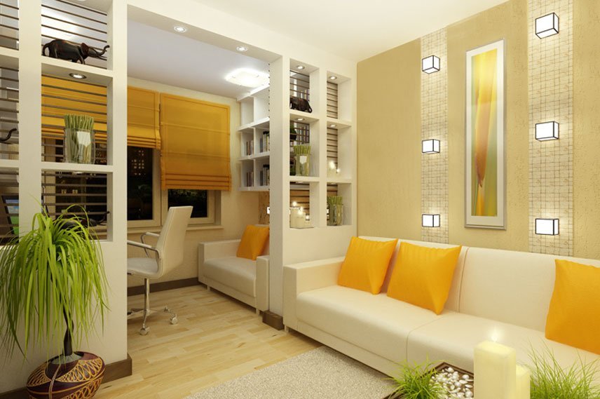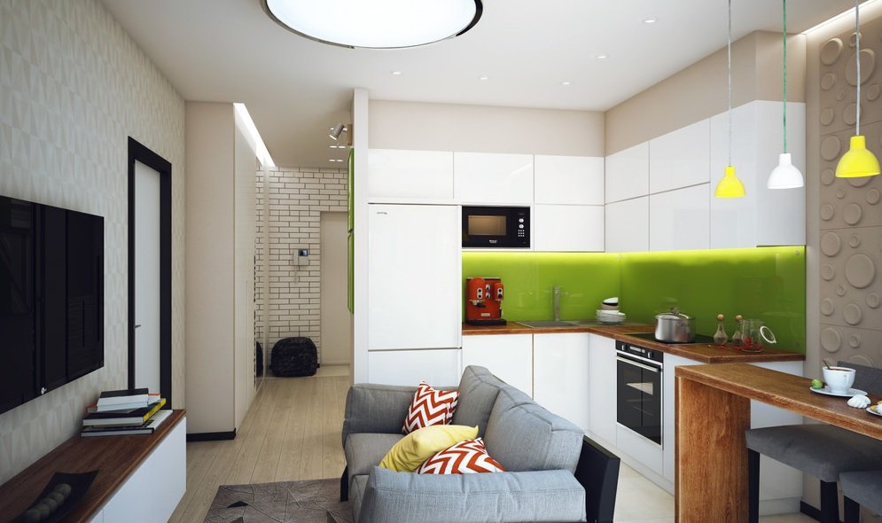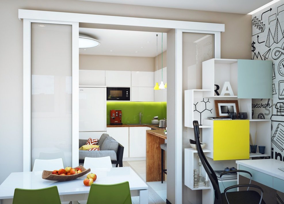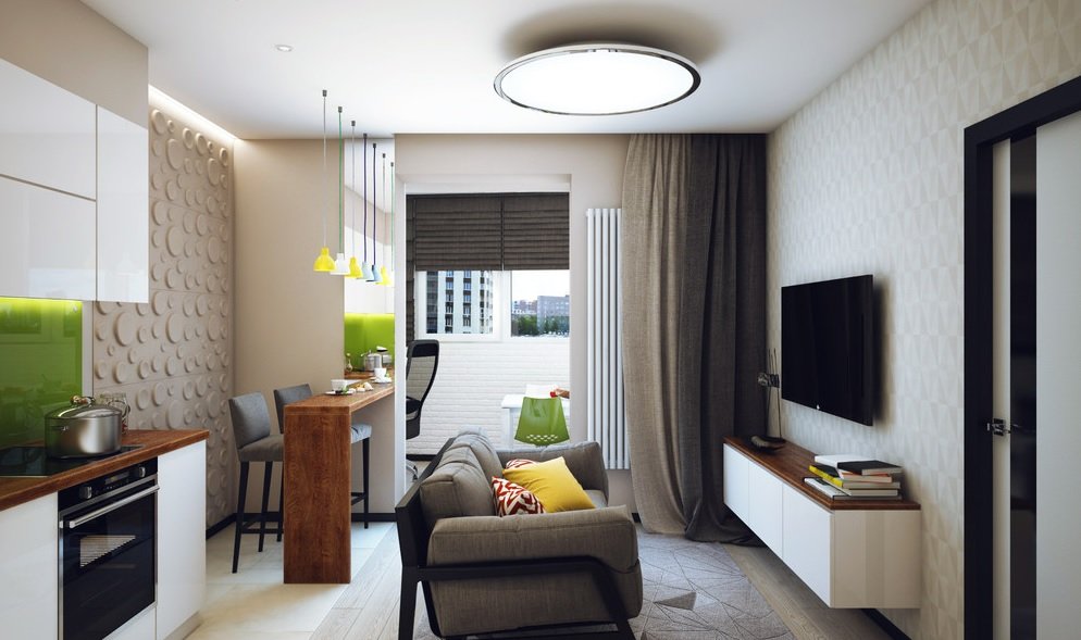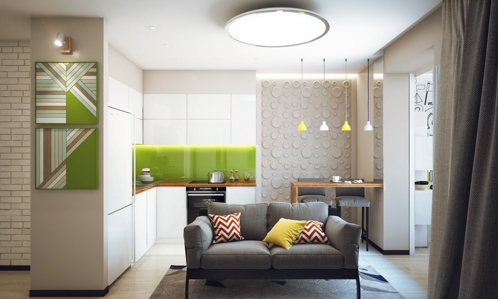El área de la cocina se puede separar de la sala de estar por un mostrador, muebles o una pequeña pared. El soporte horizontal sirve simultáneamente como mesa de comedor. Esto no solo ahorra espacio en la cocina, sino que también hace que el espacio sea más funcional. La pared divisoria se puede decorar con macetas. Para la zona principal del apartamento, se recomienda comprar un juego de muebles espacioso. Él puede compartir espacio. Para ahorrar espacio, se recomienda comprar un sofá, que se encuentra en una cama. Una bolsa de silla es útil para el área de relajación. Un adulto puede sentarse cómodamente sobre él. Si el inquilino tiene mucha ropa o zapatos, entonces está justificado crear una sección separada para el armario. El área de trabajo se coloca en el lugar menos ruidoso. Es recomendable que esté lo más cerca posible de la ventana. Su elemento principal es un escritorio compacto y funcional.