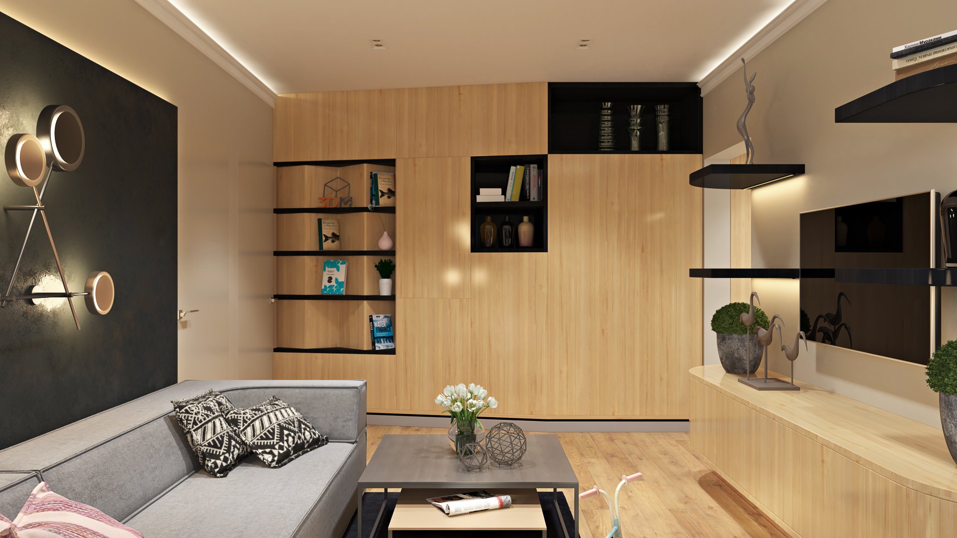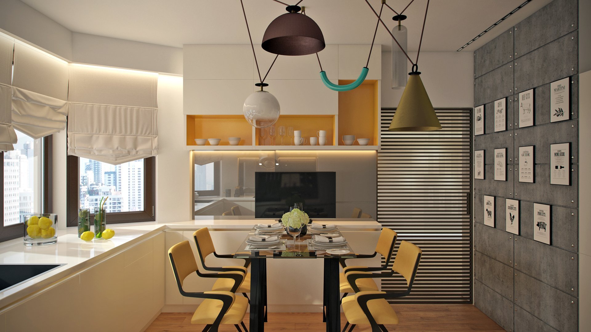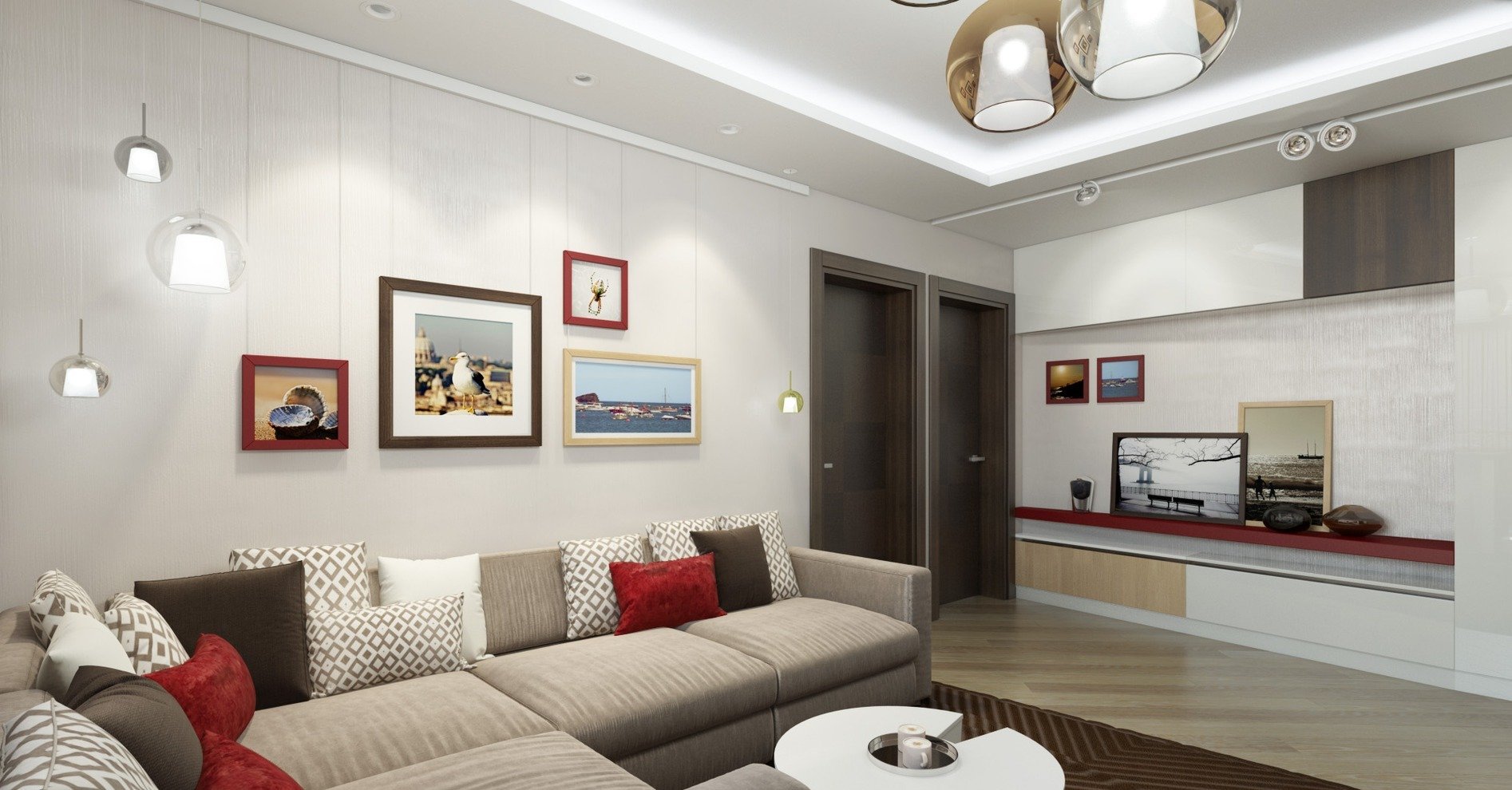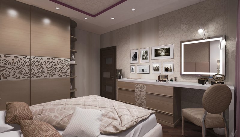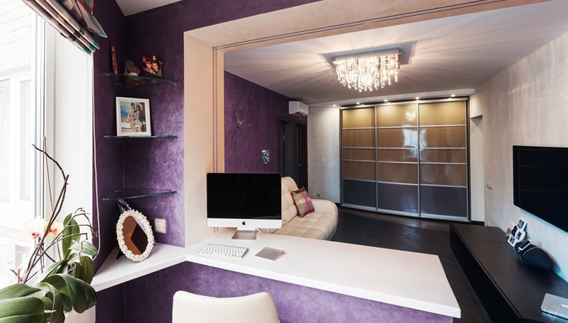 El diseñador de reparación más popular para una familia de 3 personas, donde el niño va a la escuela u otra institución educativa. Necesita un espacio personal con lugares para dormir y trabajar, así como un armario para guardar cosas. En este caso, el apartamento resulta en dos habitaciones separadas. Un lugar para reuniones familiares es la cocina. Es mejor no combinar el baño. En el baño, para ahorrar espacio, puede usar no una bañera, sino una cabina con ducha.