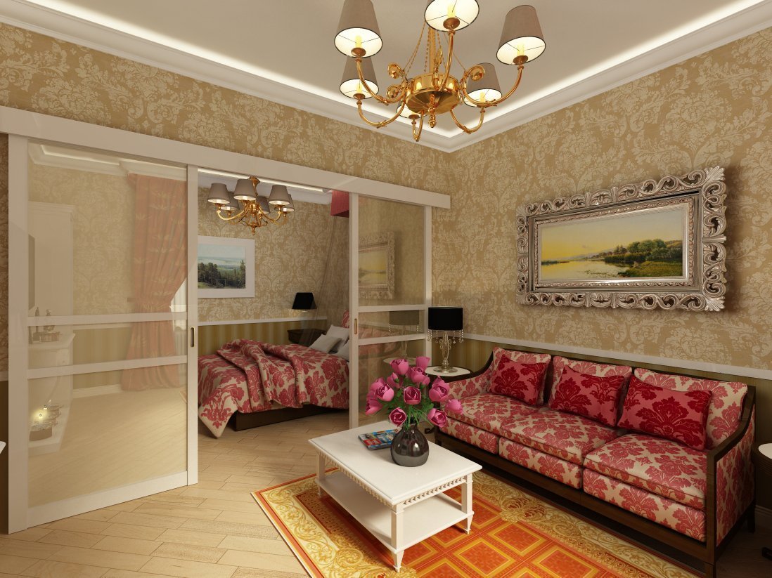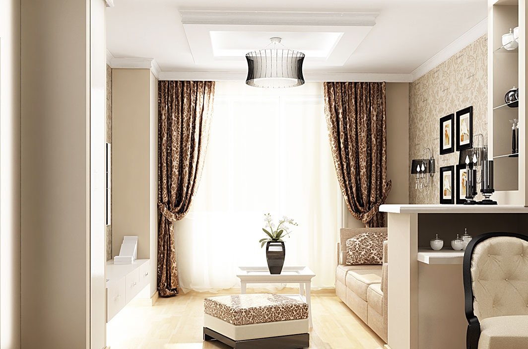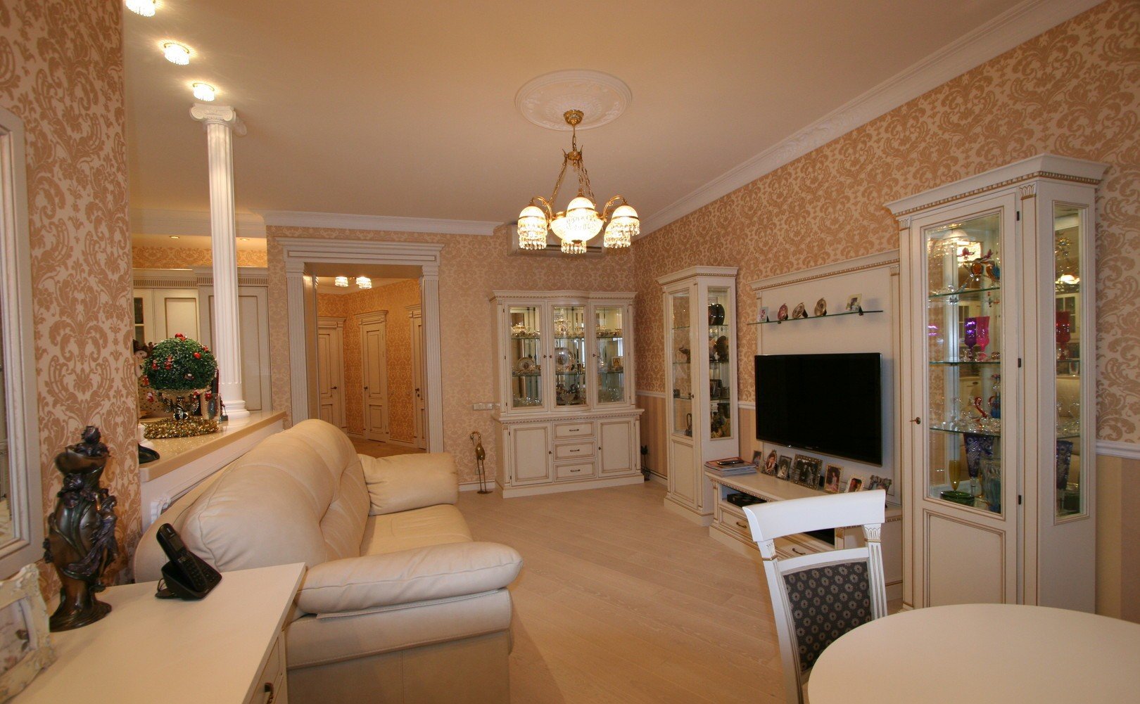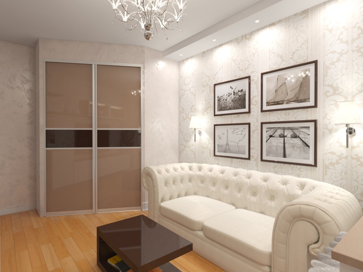 Clásico Los cánones de estilo requieren una abundancia de muebles caros de alta calidad, lujosos y monumentales.Para un apartamento relativamente pequeño, el neoclasicismo con accesorios característicos, pero sin una pompa excesiva, es más apropiado.