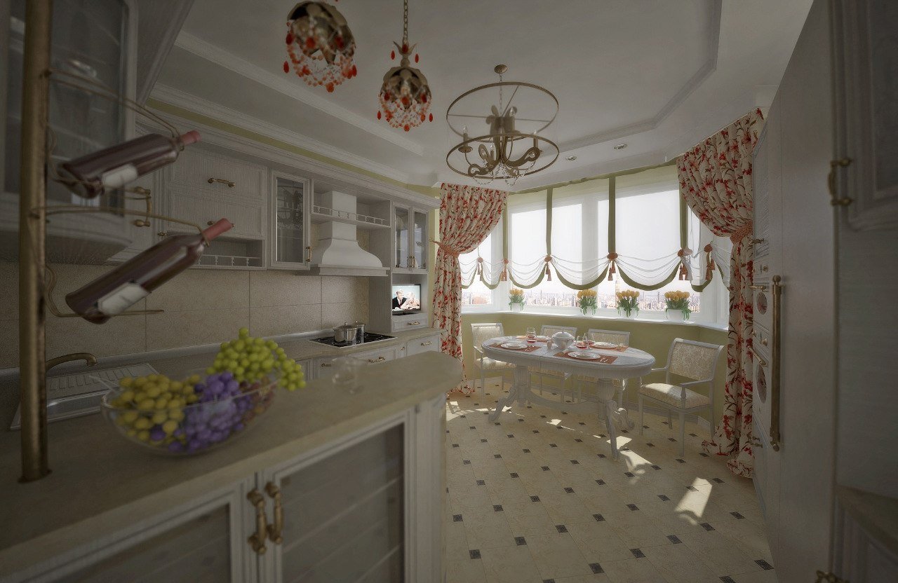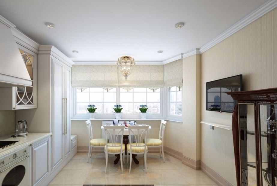 También es necesario pensar en "ropa" para ventanas. El propósito de la construcción del ventanal es proporcionar buena iluminación en la habitación. Por lo tanto, las cortinas pesadas sordas no son adecuadas aquí. La versión específica de las cortinas depende del uso de la ventana salediza. Las cortinas enrollables o persianas son adecuadas para un jardín botánico o una oficina.Es aconsejable decorar el comedor o el lugar de descanso con cortinas hechas de textiles ligeros. Las cornisas usan perfil, redondo o cuerda. Si le gusta todo lo que no es estándar y único, vale la pena pensar en las vidrieras.