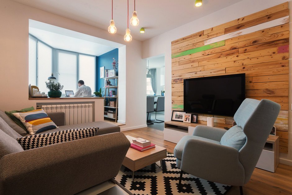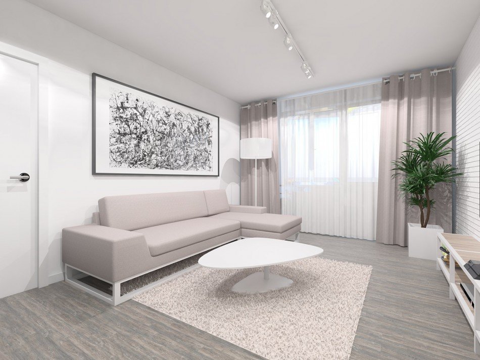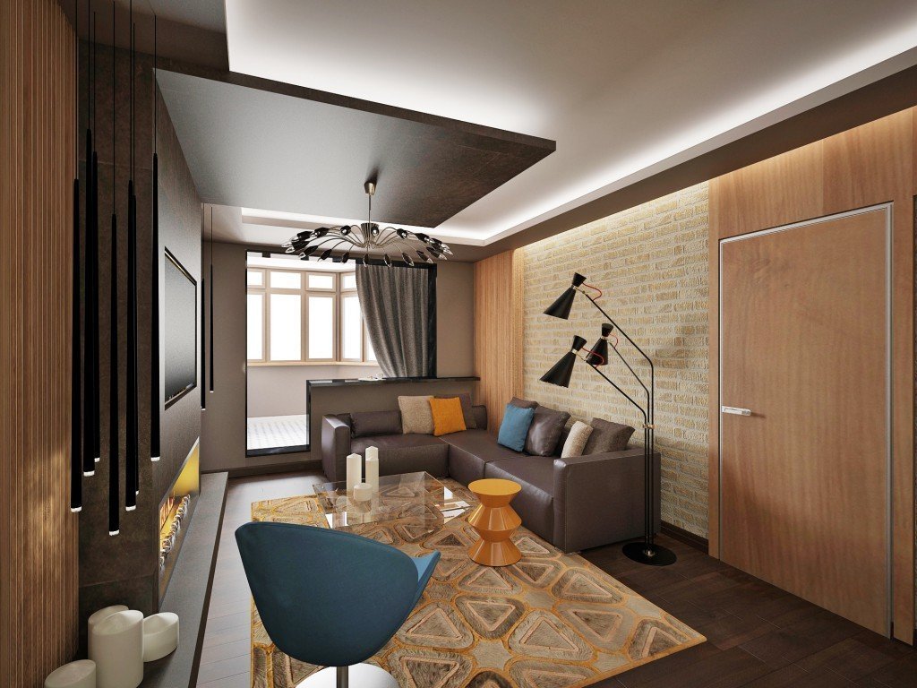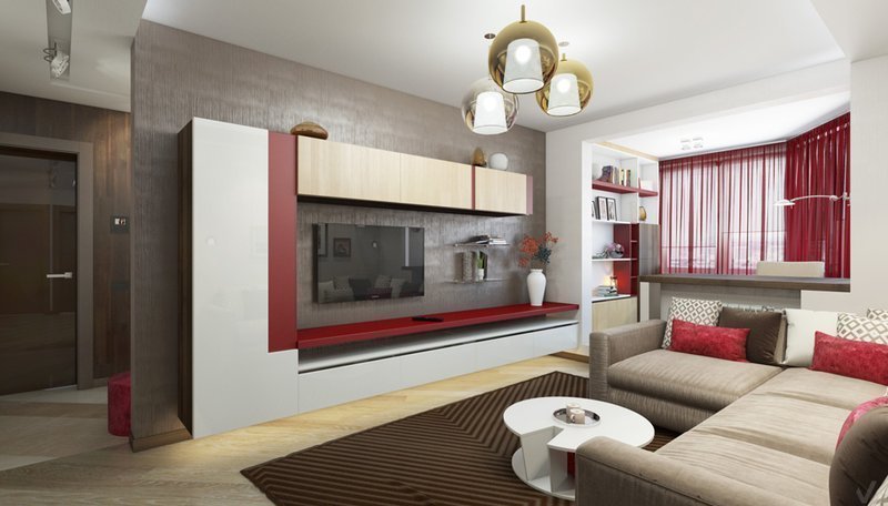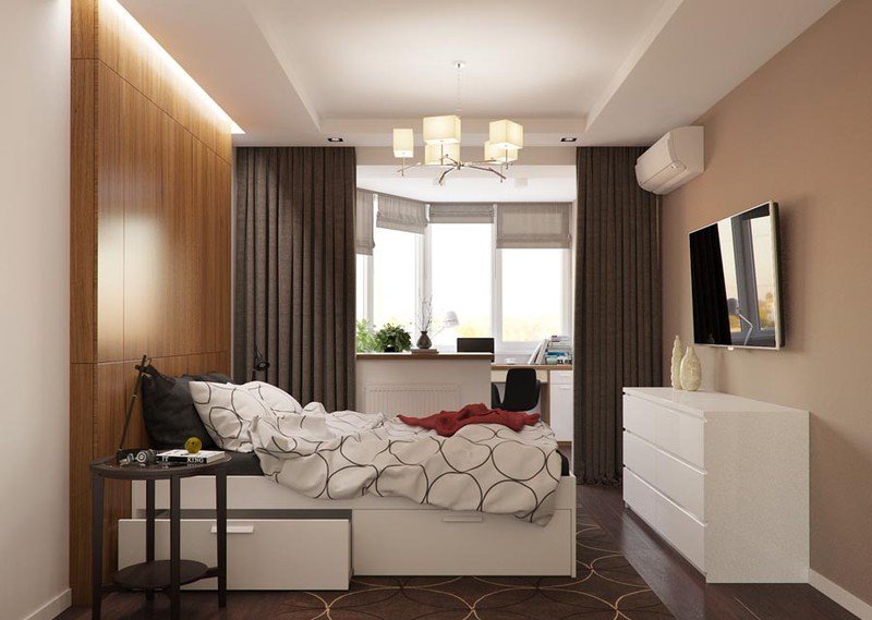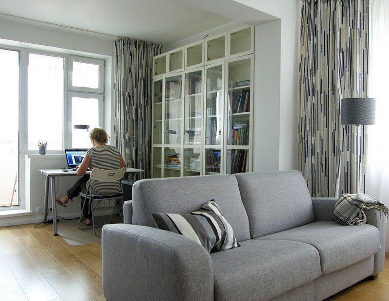 Esta es una solución para una pareja joven sin hijos. Quizás alguien está trabajando desde casa, de forma remota. En este caso, se mantiene la funcionalidad tradicional de las habitaciones. Más pequeño por sq. m la habitación está reservada para el dormitorio, una gran sala de estar. Aquí los propietarios podrán organizar reuniones con amigos. Un gran sofá de esquina con almohadas decorativas es apropiado en el pasillo. El pasillo está separado de la sala por una barra de bar sorda. Es conveniente colocar su oficina en casa en una logia acristalada.